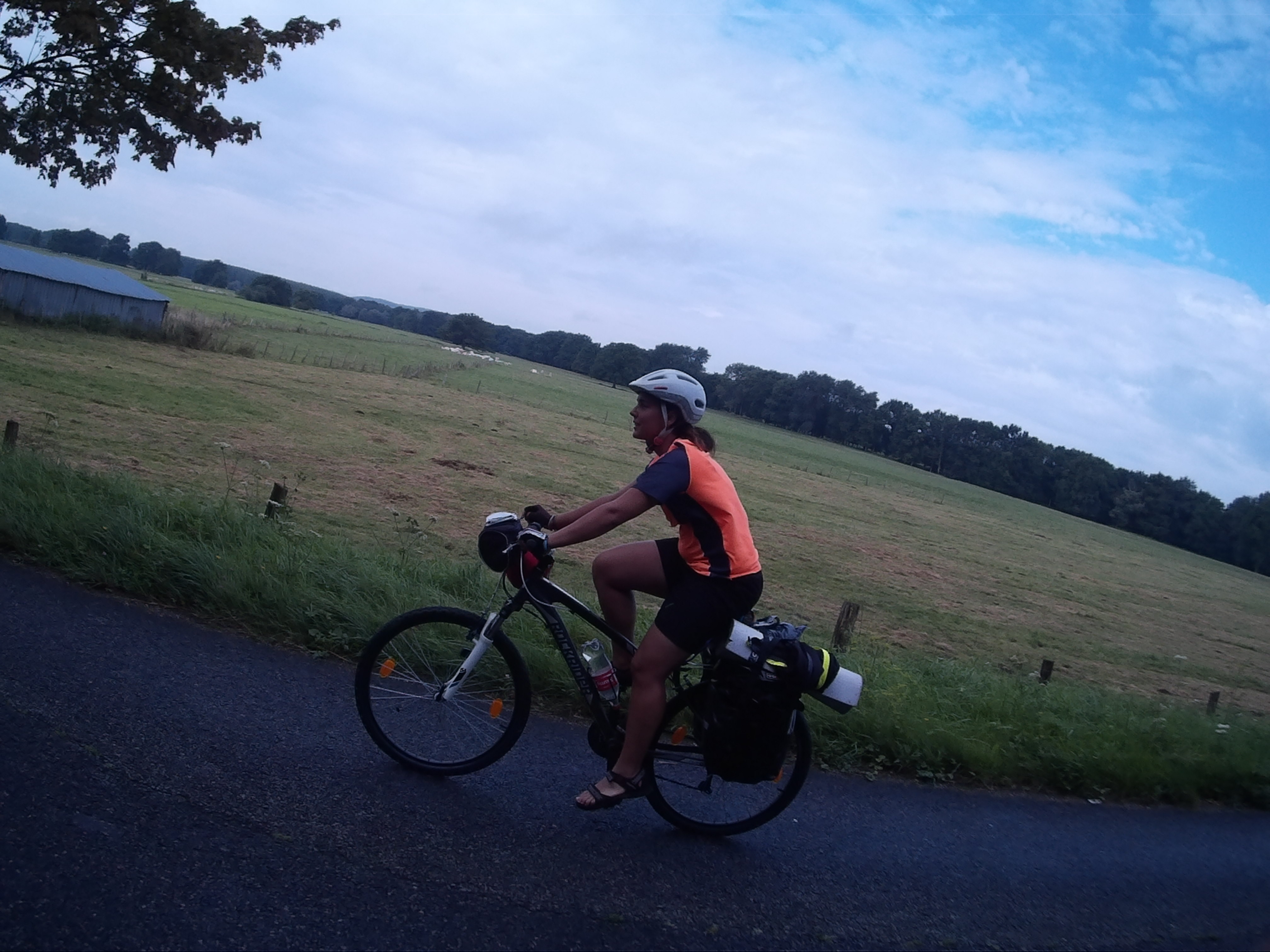 Una vez en Etampes, fuimos en dirección al Hospital y luego en dirección a Saclas. Es una carretera secundaria, sin apenas desnivel ni coches. Llegamos a Mereville, con un fuerte viento en contra nuestra que nos impedía avanzar con facilidad. Comemos debajo de un porche, a la salida del pueblo y empieza a llover. Así que decidimos quedarnos más de lo previsto. Nos dormimos un rato, mientras veíamos la lluvia caer y, a eso de las 17:30, con el cielo más despejado, decidimos recoger y seguir nuestro trayecto. El viento seguía a nuestra contra, así que dos horas más tarde, decidimos parar en Bazodhes y dormir donde pudiéramos. no había sido un buen dia, después de tantos cambio de trenes, lluvia y viento.