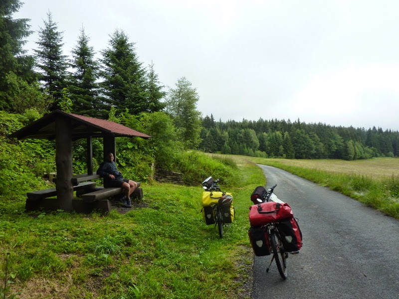 Al llegar a Sucha Beskidzka decidimos finalizar nuestro día de pedaleo, el tráfico nos estaba estresando bastante y comenzamos a buscar alojamiento. Del camping nadie sabía nada y en el hotel que preguntamos no había habitaciones libres. De repente comenzó a diluviar y tuvimos que refugiarnos bajo los soportales de un edificio. Enseguida acudieron los borrachos del lugar, que a punto estuvieron de tirarnos las bicicletas al suelo. Después de estar media hora a cubierto, la lluvia paro un poco y abandonamos pronto el lugar, había que deshacerse de los borrachos que solo nos podían crear problemas.