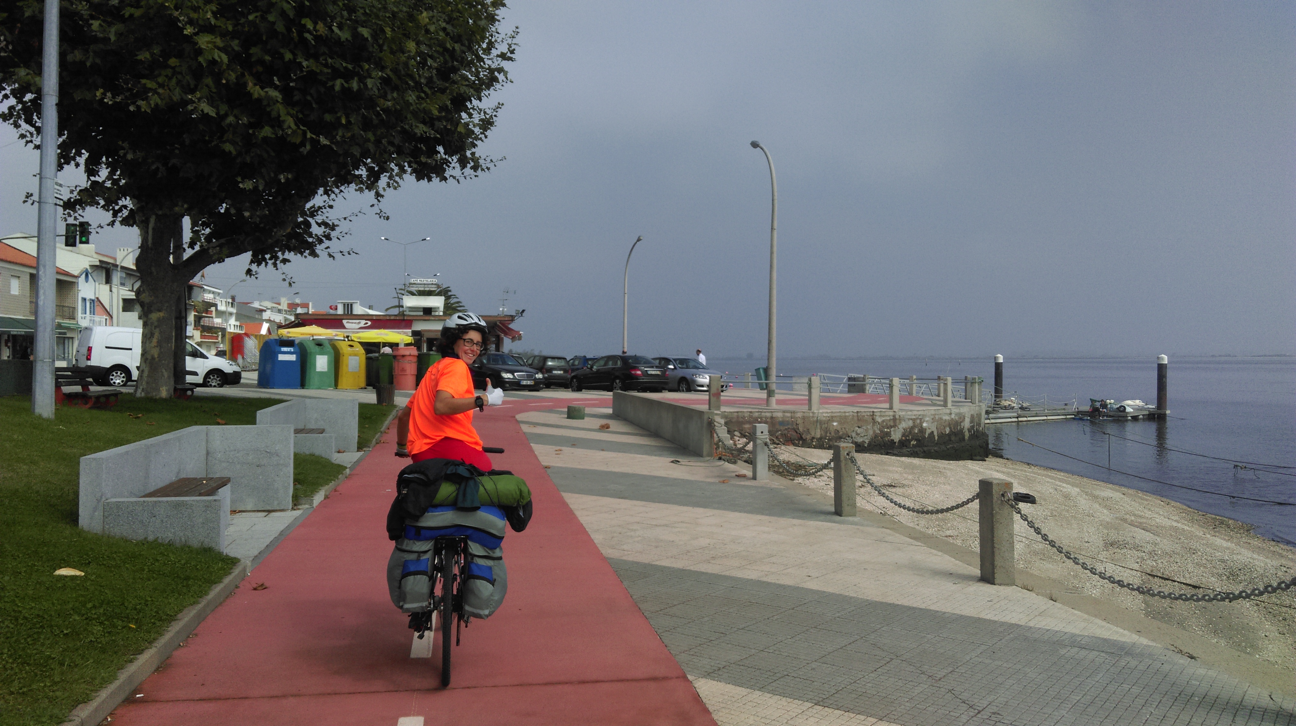 Hay cogemos el primero de los dos ferrys del viaje. Ayer miramos los horarios, a las 10.20 y a unos 25-30km de Mira en Sao Jacinto. Salimos a las 9.15 con plena certitud que lo alcanzaríamos. Llevamos un ritmo inicial muy bueno casi 30km/h. Estamos ya en Sao Jacinto no encontramos demasiado bien señalizado el camino al puerto, nos pasamos de largo y tenemos que retroceder…perdemos unos minutos, ja es la hora, no hemos llegado pero no perdemos la esperanza. Desafortunadamente llegamos al lugar de embarcación 15’ más tarde, lo perdimos hasta las 12 no sale el siguiente.
