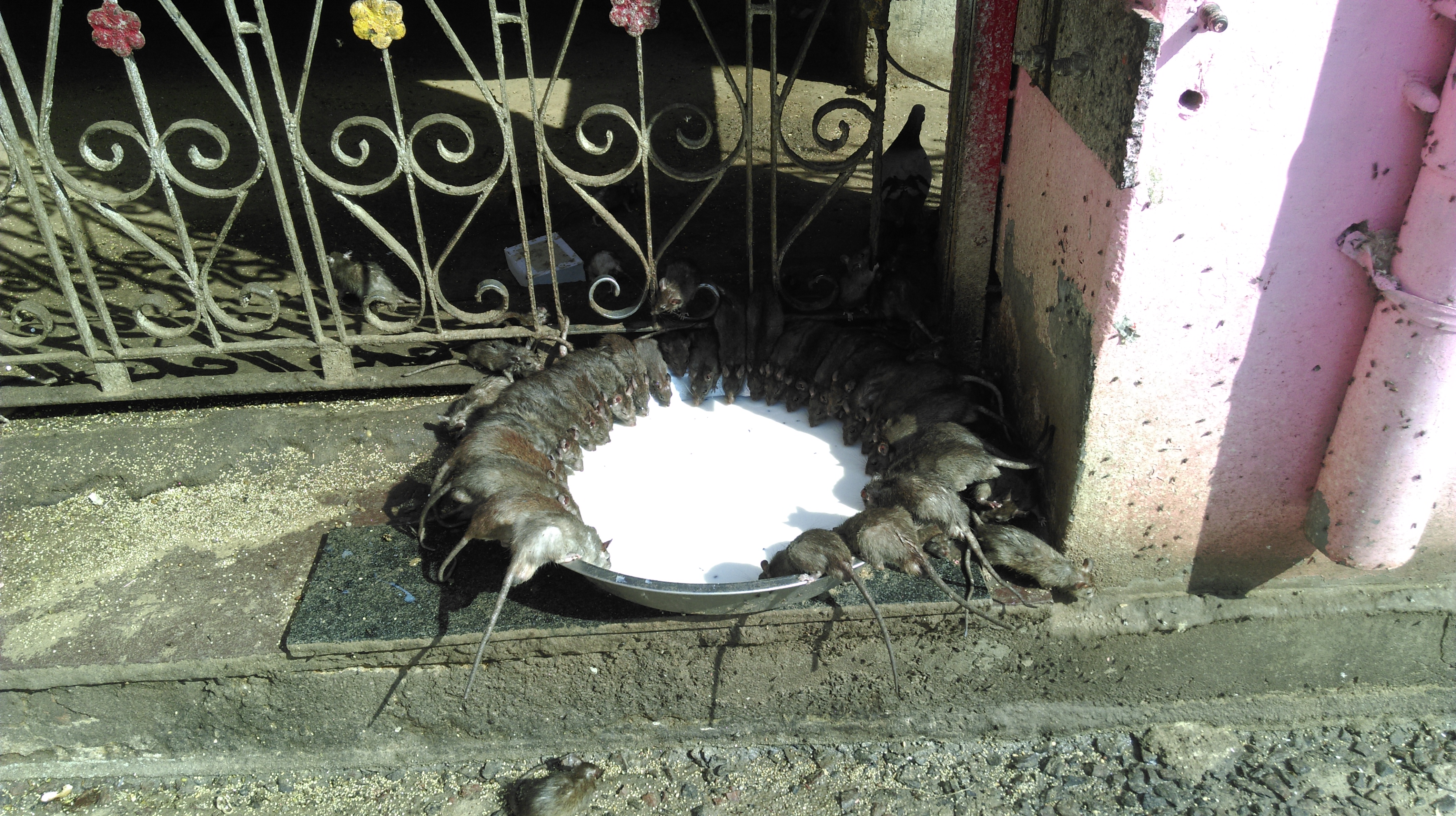 Después de casi 1 hora, hemos vuelto al coche, eran las 9:45 cuando cogíamos de nuevo el coche dirección Bikaner. Han sido unas 3, 5 horas, aunque nos hemos desviado un poco para ver el templo de las ratas. Parece sorprendente que la gente vaya a cuidarlas, alimentarlas y a rezar. Cuenta la legenda que la gente del pueblo que muere se reencarna en rata y por eso son sagradas…) La entrada al templo es gratuita.
