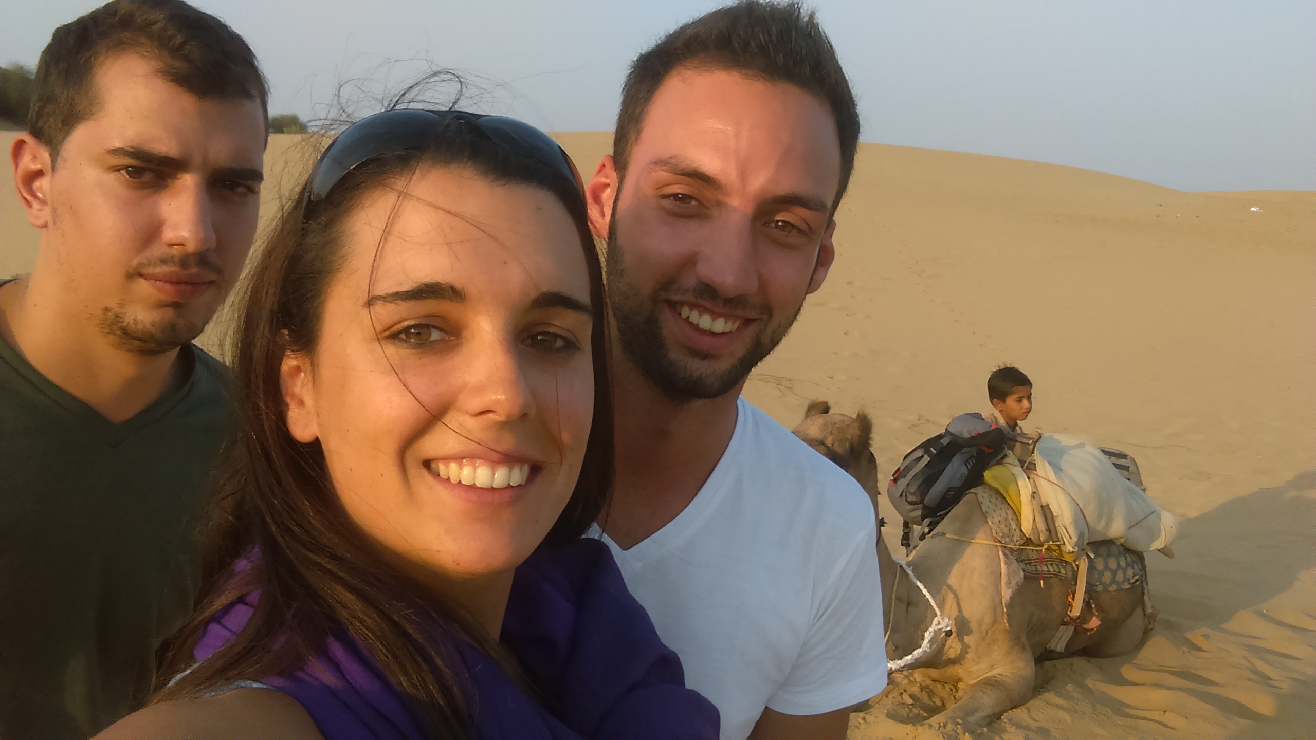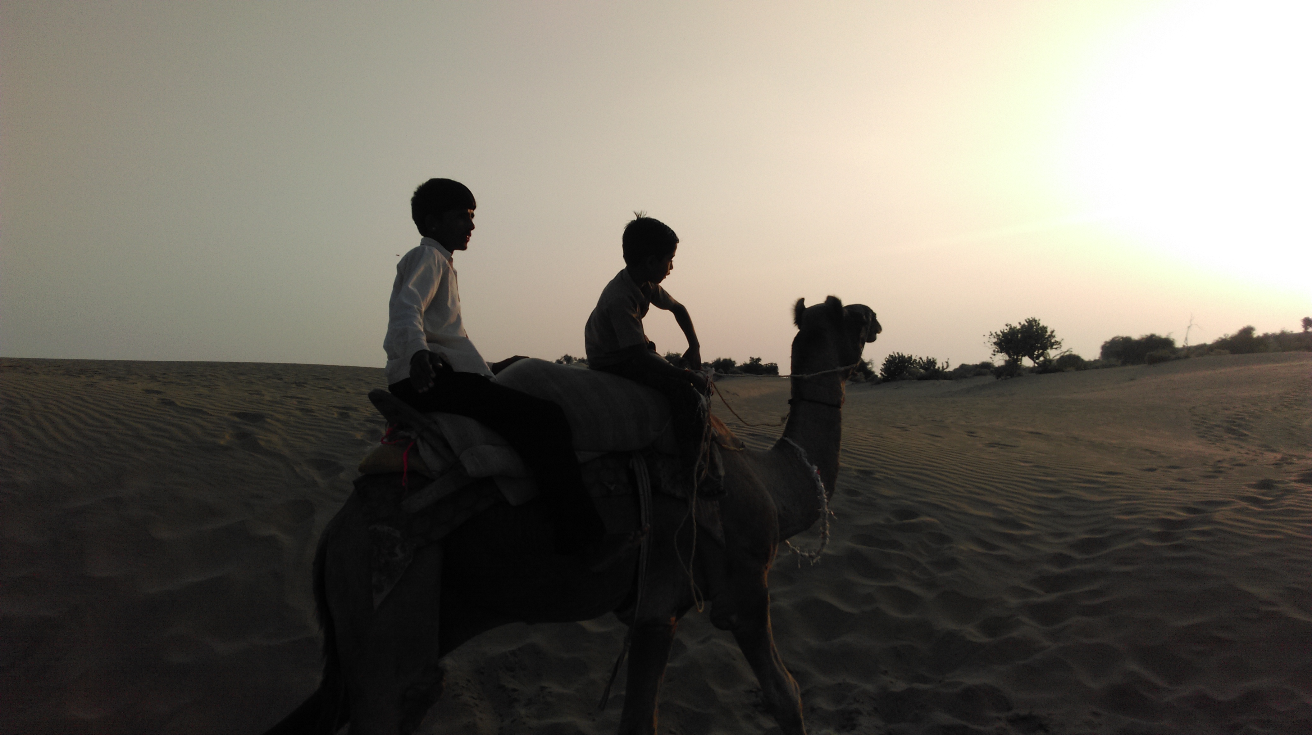 Finalmente llegamos a la zona del desierto y nos dirigimos a una compañía que se encarga de montar la pequeña excursión con camello. Nuestra aventura empieza montados en un camello (cada uno con el suyo), nos acompañan 3 niños, de 6, 8 y 12 años. Son monísimos! A mitad del camino paramos a descansar y ver la puesta de sol en las dunas del desierto. No es un desierto demasiado grande pero tiene dunas y jugamos con los niños en la arena. Después de ver el sol como desaparece volvemos a montar en camello hasta la zona donde finaliza nuestro recorrido. Allí nos reciben con tambores, música y baile. El espectáculo es para dos parejas y nosotros. Nos sirven un aperitivo y, después de una danza todos juntos alrededor del fuego, cenamos. También es buffet y la comida está muy buena.