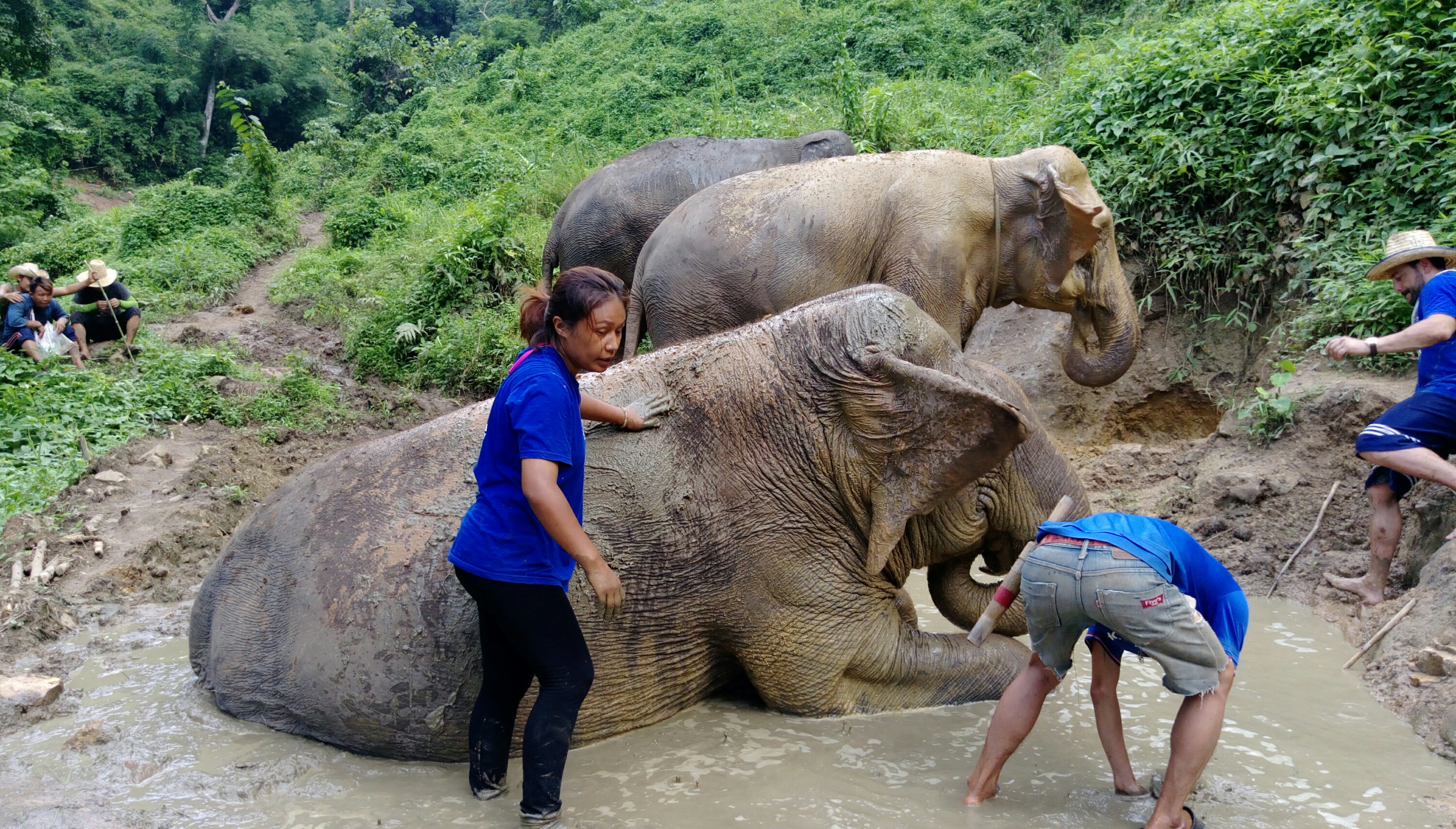 En total hemos hecho unos 6km en 2:30h aprox, había elefantes que se paraban mucho a comer y se perdía un poco de tiempo además de porque estábamos en la selva y el camino en muchos tramos estaba embarrado y resbalava. Durante el camino hemos pasado por una mini charca donde algun elefante se ha estirado para que le echaremos barro, otros se lo tiraban ellos mismos…