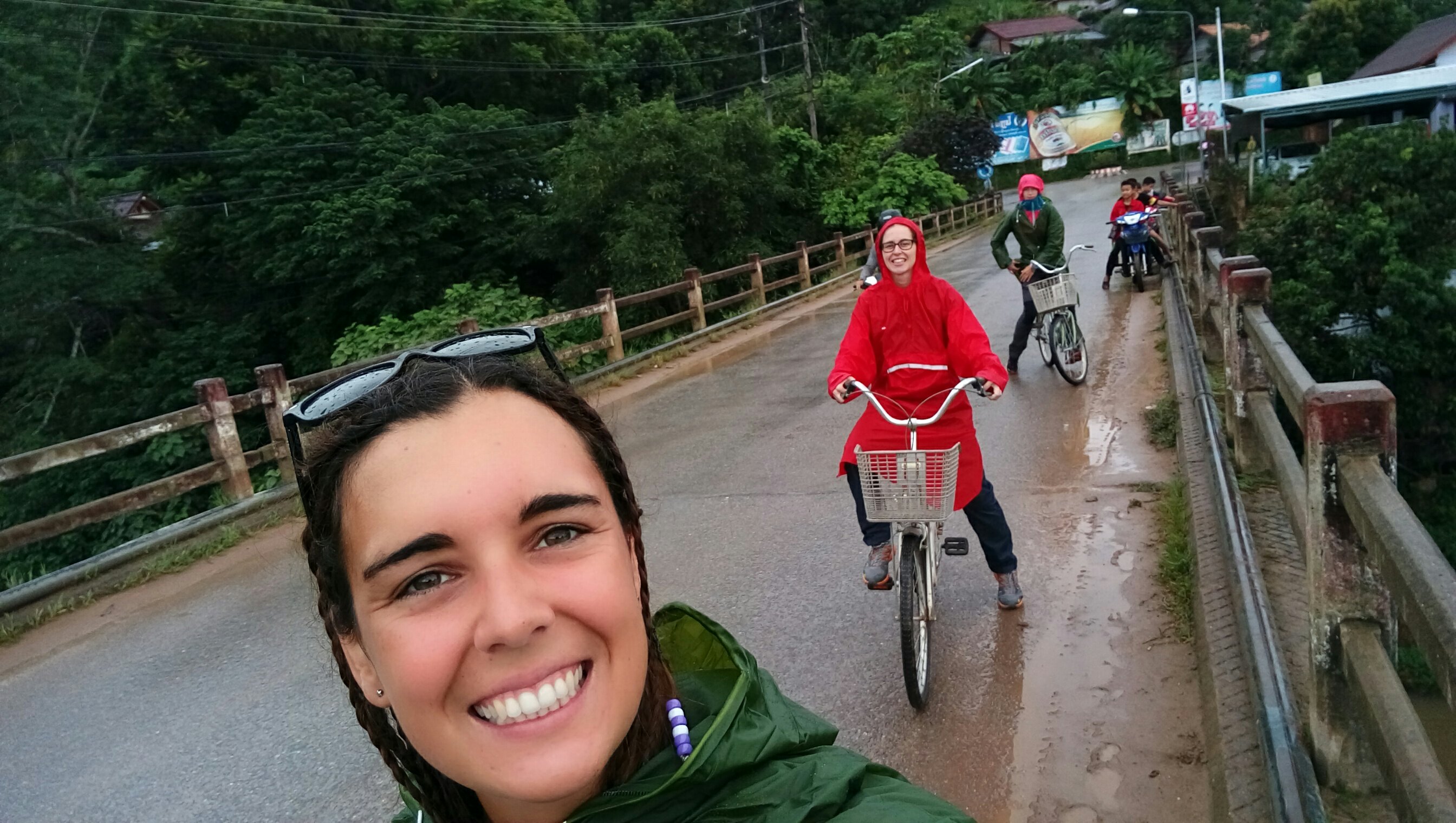 La primera parada ha sido en las cascadas Nam Dee. El camino al principio era asfaltado, luego las piedras, charcos y arenilla nos han ido acompañanando durante 3 km hasta la entrada, donde hemos pagado 10.000 kips x la entrada i 1.000 kips por la bici (1 euro i 10 centomos aprox).