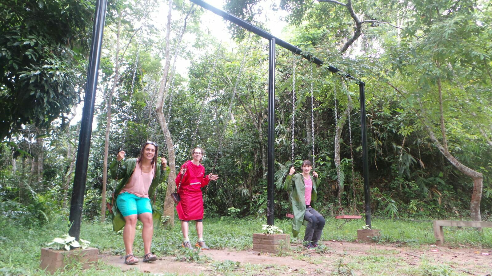 La primera parada ha sido en las cascadas Nam Dee. El camino al principio era asfaltado, luego las piedras, charcos y arenilla nos han ido acompañanando durante 3 km hasta la entrada, donde hemos pagado 10.000 kips x la entrada i 1.000 kips por la bici (1 euro i 10 centomos aprox).