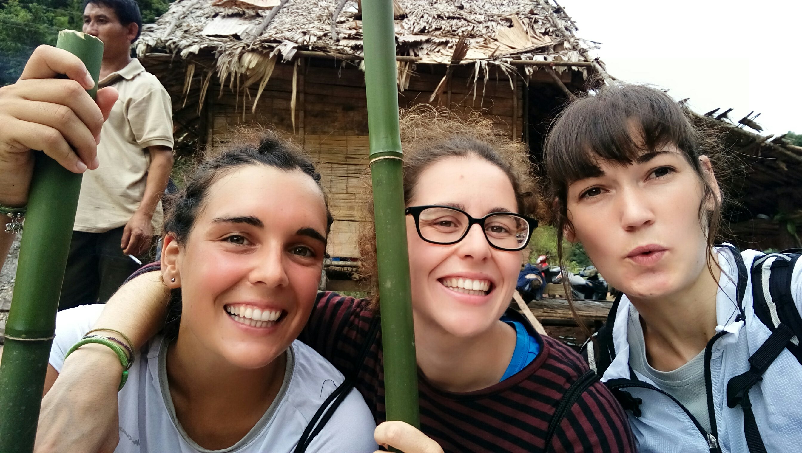 Hacemos una parada donde, nuestro guia, nos hace unos bastones con bambú para poder seguir avanzando. Ahora, el chico va con unas chanclas de playa y pantalon corto…