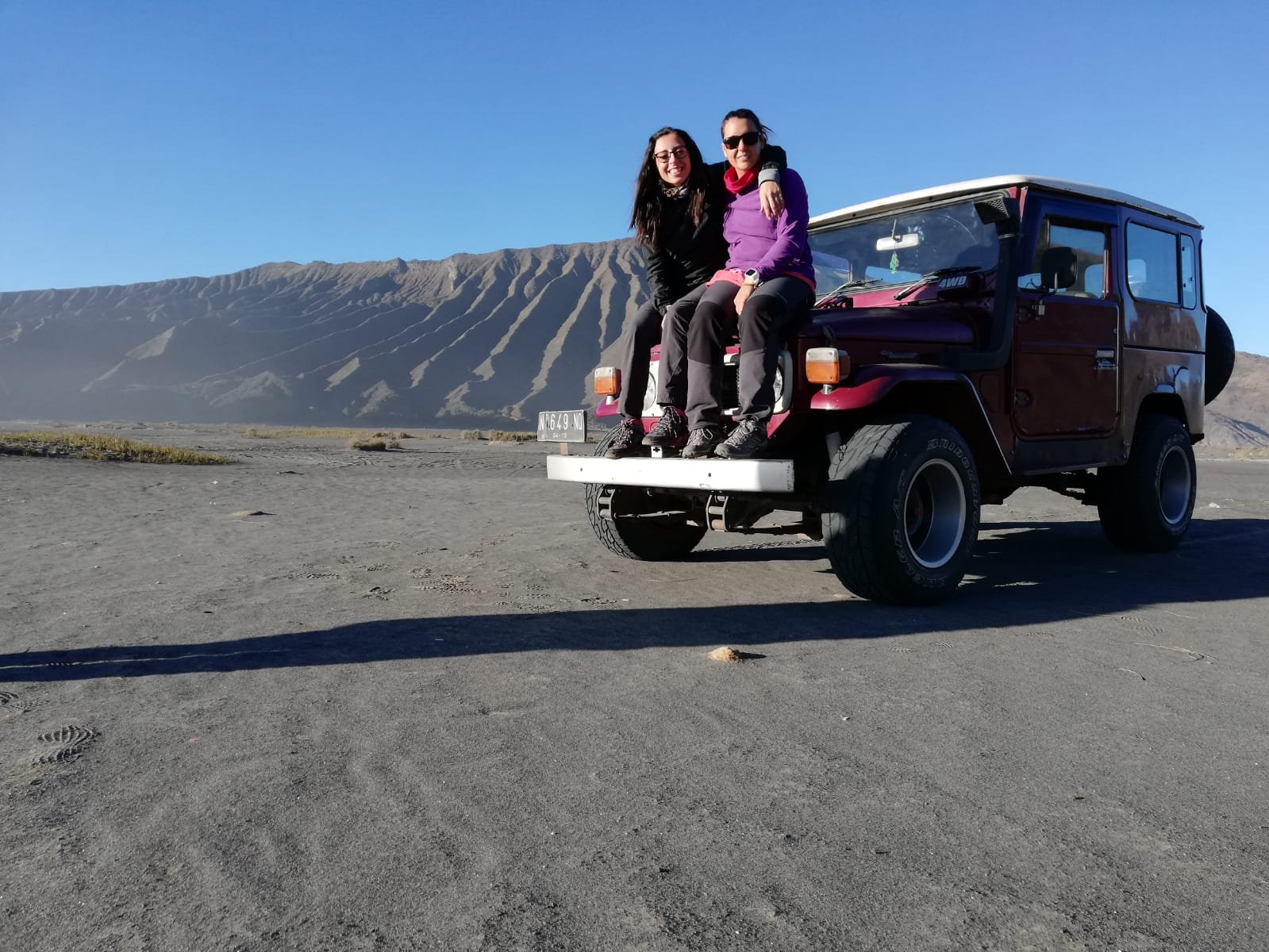 Una larga cola de jeeps se forma. Todos vamos al mismo lugar: al cráter del volcan Bromo. Antes paramos ha hacernos unas fotos con el jeep y con el volcan de fondo.