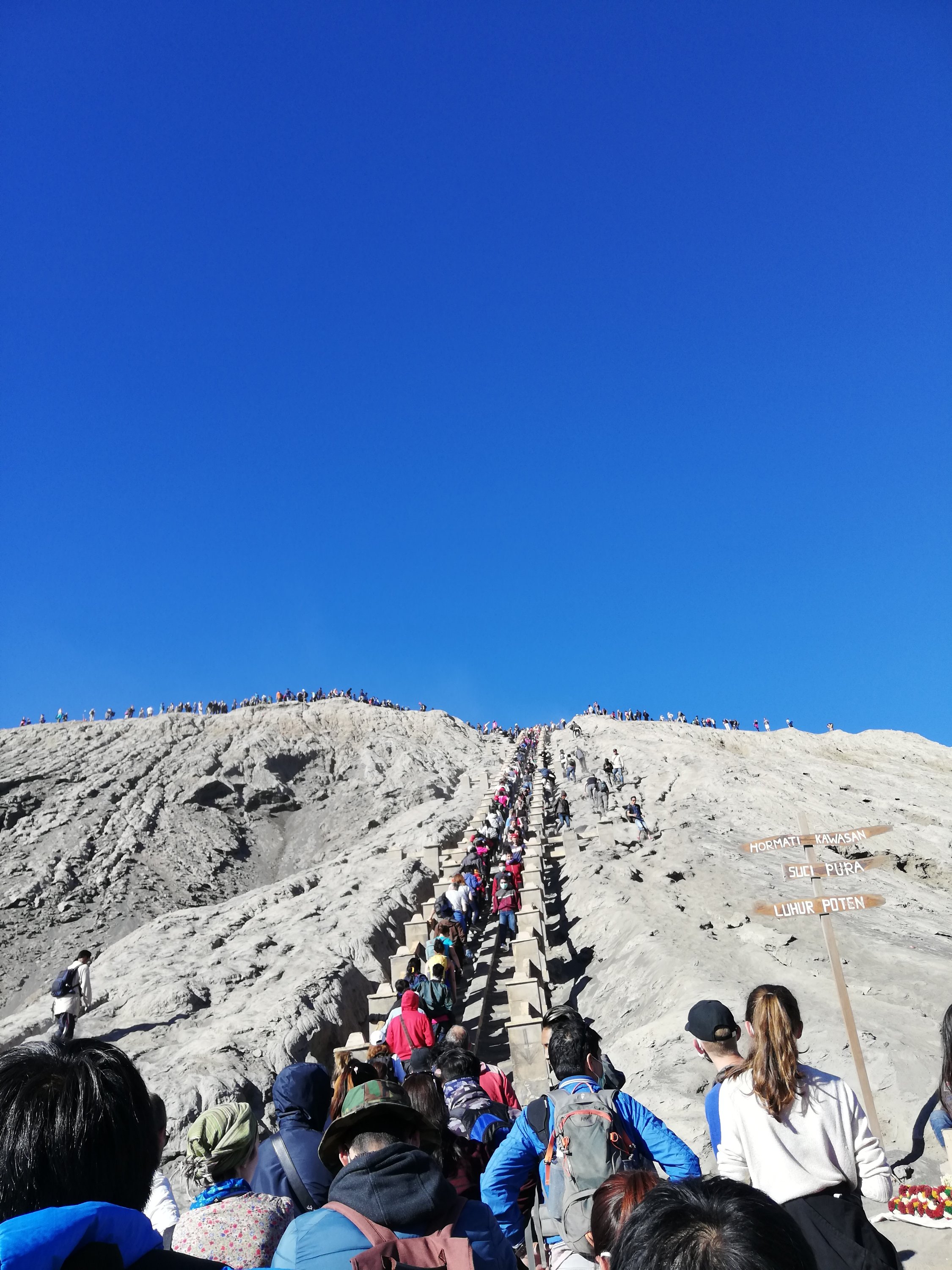 En las escaleras ya se divisa el final. Hay tanta gente que tenemos que esperarnos un poco para poder subir!