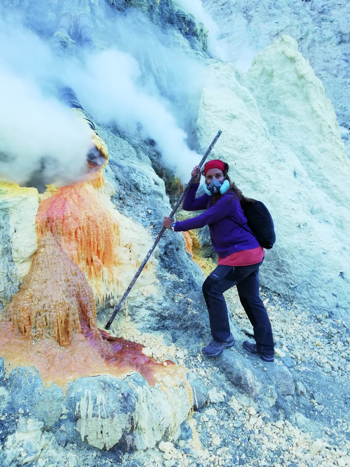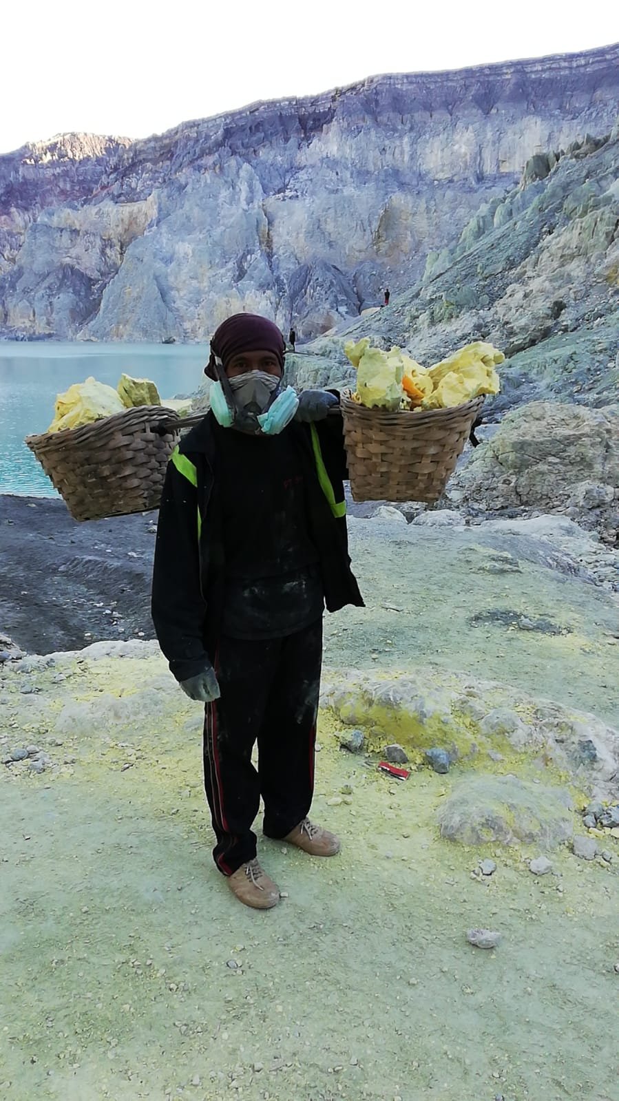 Más tarde, ya con la luz del día, pudimos ver como los mineros extraían el azufre que salia del volcan y lo cargaban en enormes cestas de entre 60-90 kg y que más tarde subirian hasta arriba para poder bajarlo al pueblo y venderlo. Nos contaron que hacen esto un minimo de 2 veces al día y que, en función del dinero que necesiten lo pueden llegar ha hacer hasta 4 veces. Su sueldo es muy precario y la esperanza de vida de uno de estos mineros es de 50-55 años.
