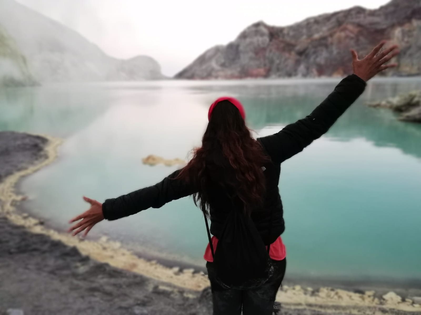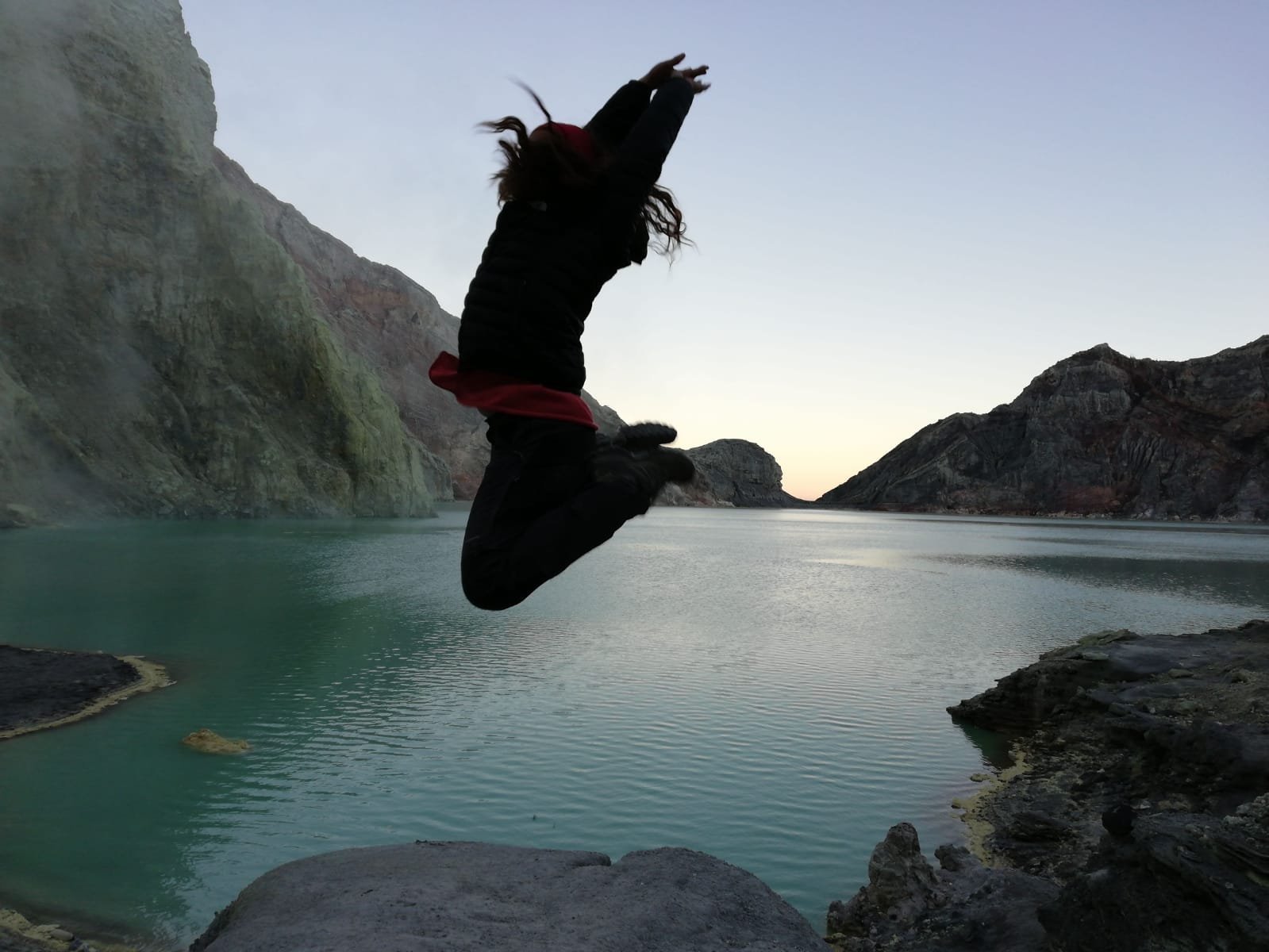 Nos esperamos en una zona para poder ver el fuego azul que, si el gas no estaba muy presente se podia ver. Aunque en este momento de espera, entre el frío por estar quietas, y el gas que nos llegaba se nos hizo especialmente molesto. Tanto garganta como ojos se irritaban y nos costaba respirar hasta que nos cambiaron de zona, delante del lago y desde donde pudimos ver el amanecer y hacer muchisimas fotos. El lago era de agua caliente y durante el dia podía llegar a herbir, por eso no se puede bajar por las mañanas pues hay mucho más gas tóxico.