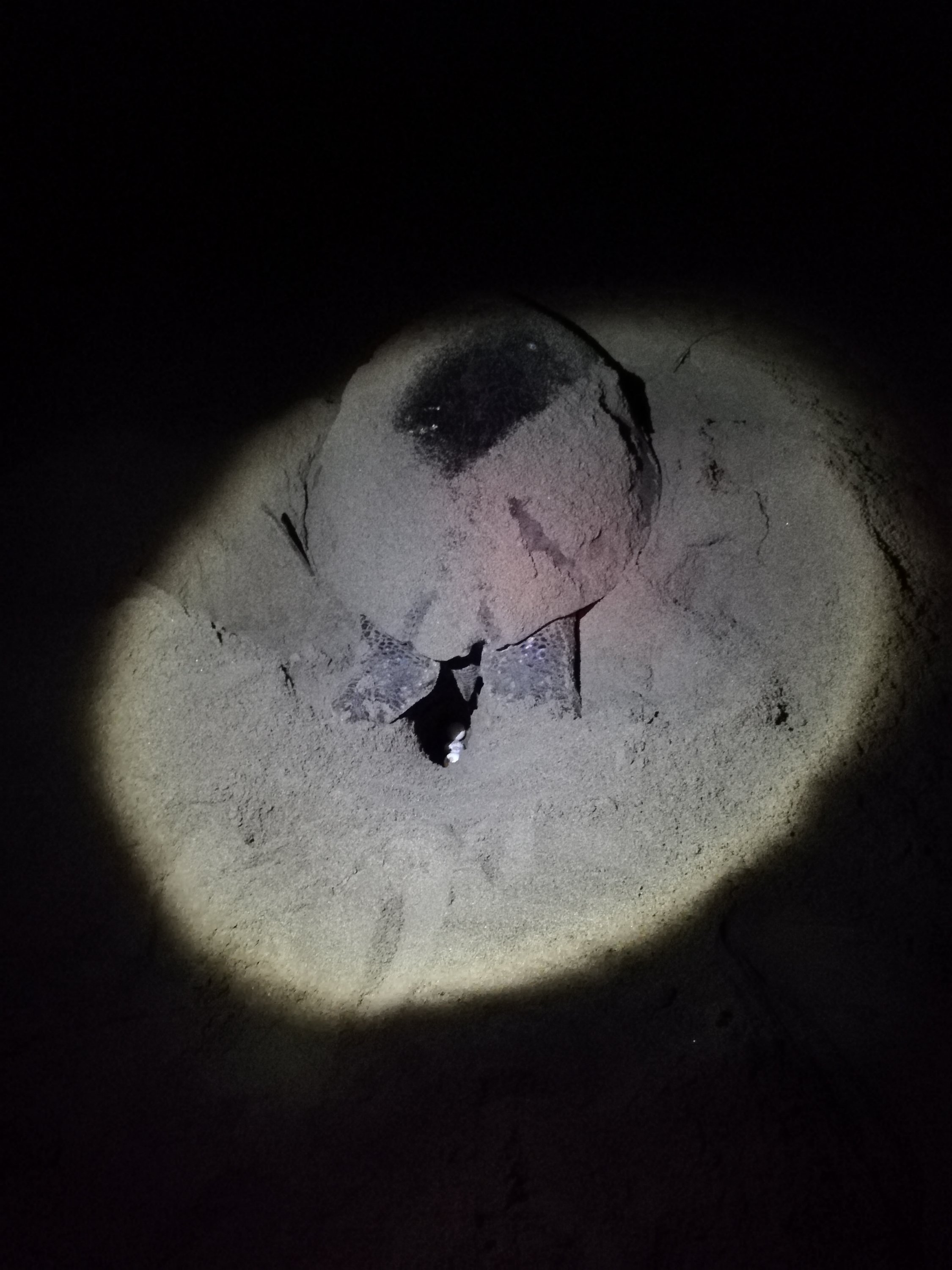 1 hora más tarde nos avisan de que ya había salido. Sin luces para no molestarla, caminamos 400 metros cercanos a la orilla hasta encontrarla. El ranger ilumina con su linterna el caparazon enorme de la tortuga (1 metro de ancho y largo) y observamos como va dejando caer sus huevos en el agujero que ha hecho previamente.
