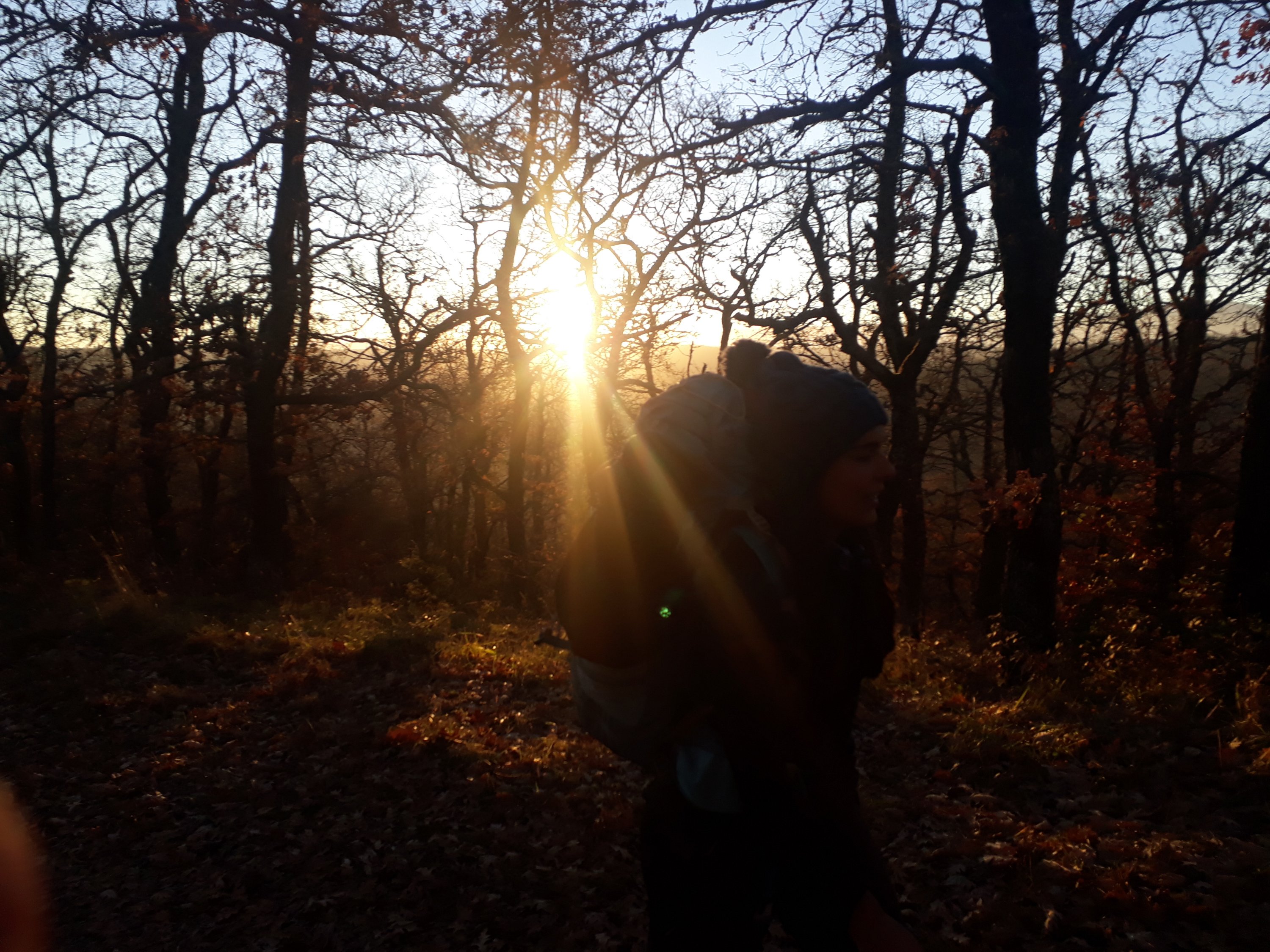 El camino es mucho más bonito que el resto de dias. Subidas y bajadas pero nada del otro mundo. Hojas otoñales en el suelo, piedras, árboles y rayos de luz. Éste es el ambiente que respiramos hoy.