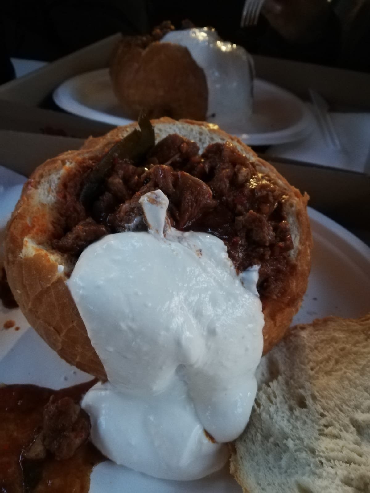Ya son las 15.00, volvemos con el bus al centro y visitamos el mercado central de productos del país y comemos un goulash de ternera con pan (vamos, estofado sin patata y puesto dentro de un pan redondo).