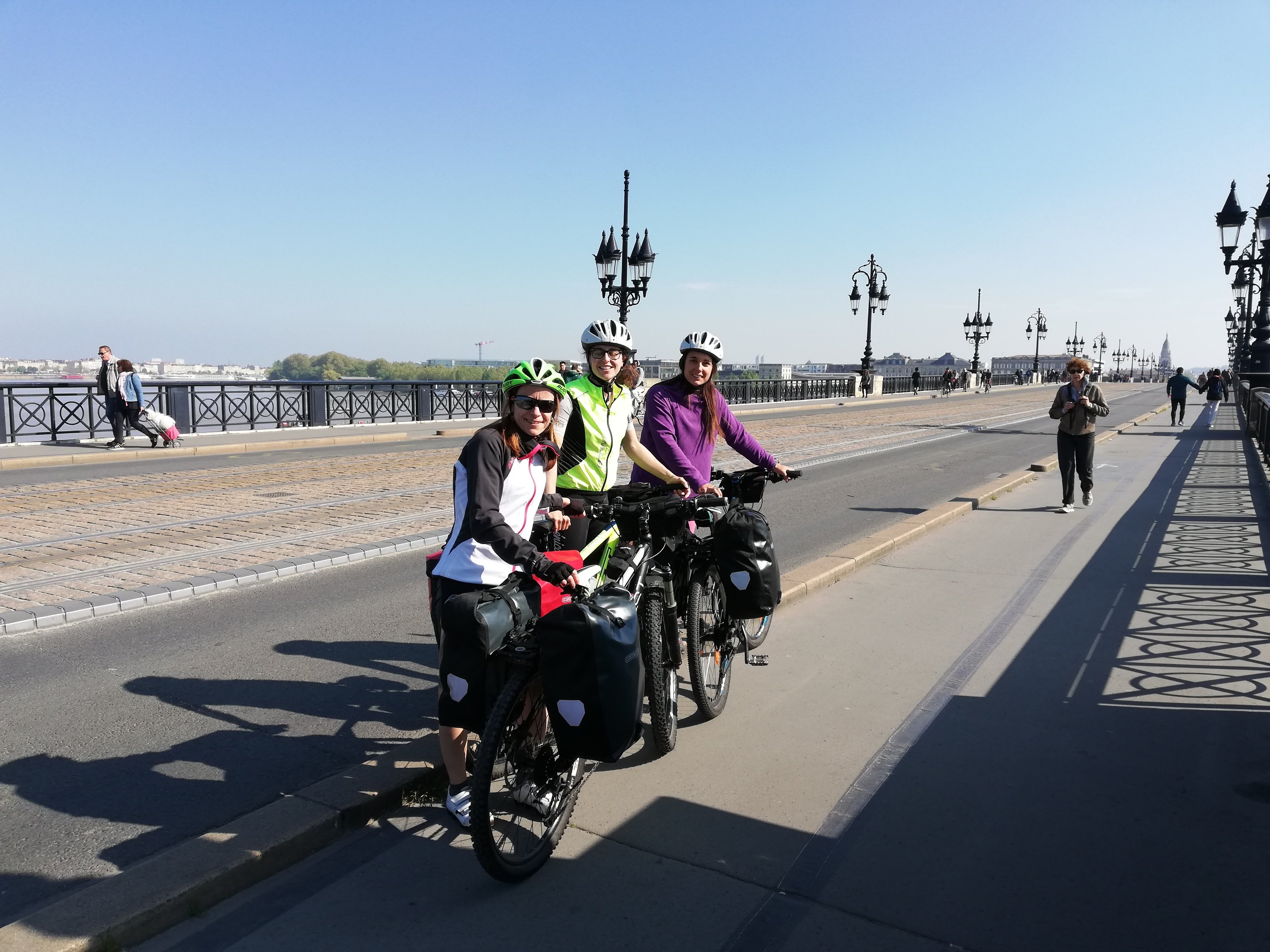 22.35h, bicicletas colocadas, y nosotras sentadas en el bus (MónBus). Nos ha costado 16€euros +13€por las bicicletas.6.10h de la mañana, llegamos a Irún. Hemos hecho 4 paradas (Alfajarin, Tudela, Pamplona, Tolosa) y llegamos. Montamos bicicletas y pedaleamos escasos 3 km hasta la estación de tren de Hendaya.A las 07.19 sale el tren. Tenemos billetes (24€) hasta Bordeus, pero no hemos cogido el suplemento de 10€ para las bicis. No sabemos como entrarlas y el revisor nos dice si tenemos hecha la reserva. Decidimos que sí y nos manda al último vagón. Una pareja que también iba en bicicleta nos comenta que ellos la han tenido que embalar porque ya no había sitio para bicicletas sin embalar… Así que vamos un poco a la aventura.Ponemos las bicis en el lugar habilitado para las mismas y nos sentamos. Nuestros billetes marcan otro vagón pero no vamos ha dejar las bicis solas. Hacemos varias paradas y no entra nadie en bici, el corazón nos va a mil cada vez que paramos hasta que visualizamos la última parada antes de Bordeus y no sube nadie. Tranquilidad absoluta hasta que llega el revisor. Nos saluda alegremente nos pide los billetes y los escanea. No se percata que no estamos en nuestro vagon, respiramos de nuevo y nos tranquilizamos. Ahora el tren corre más.