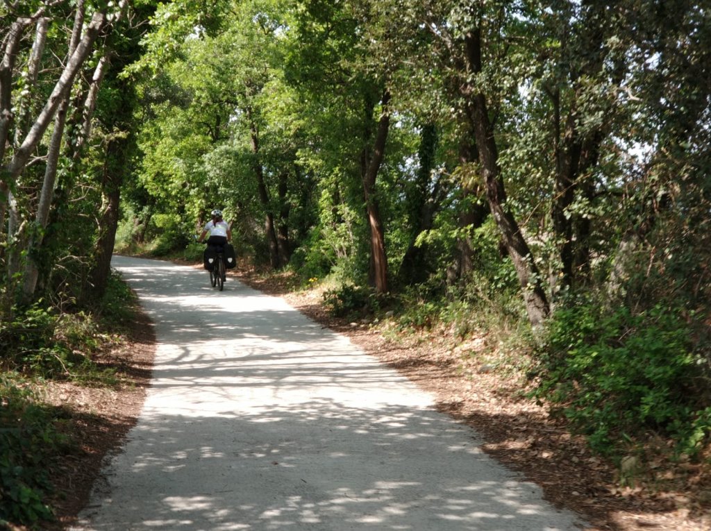 El carril bici atraviesa pequeños pueblecitos y nos adentra por carreteras secundarias que han dejado casi su uso. Esta marcado con cartelleres de la Eurovelo 8 y en el suelo hay dibujos con marcas que señalizan el quilòmetro y la dirección. Aparte se une con el camino de Santiago así que empezamos a ver también señalizacion de esta emblemática ruta.