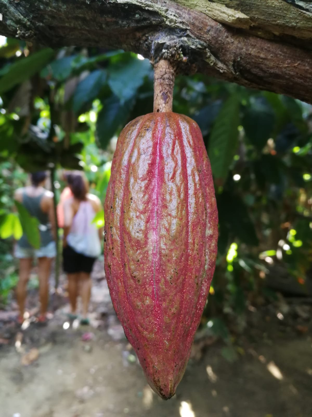 Nos explican que el cacao tiene fruto todo el año, pero la mejor época es en setiembre cuando no hace ni demasiado calor, ni demasiado frío. El cacao crece bajo la sombra y si tiene un platanero cerca que se la de y además, lo humedezca, mejor. Cuando el fruto está grande con un machete miran de que color es por dentro y si tiene buen color lo cortan y sacan del árbol.