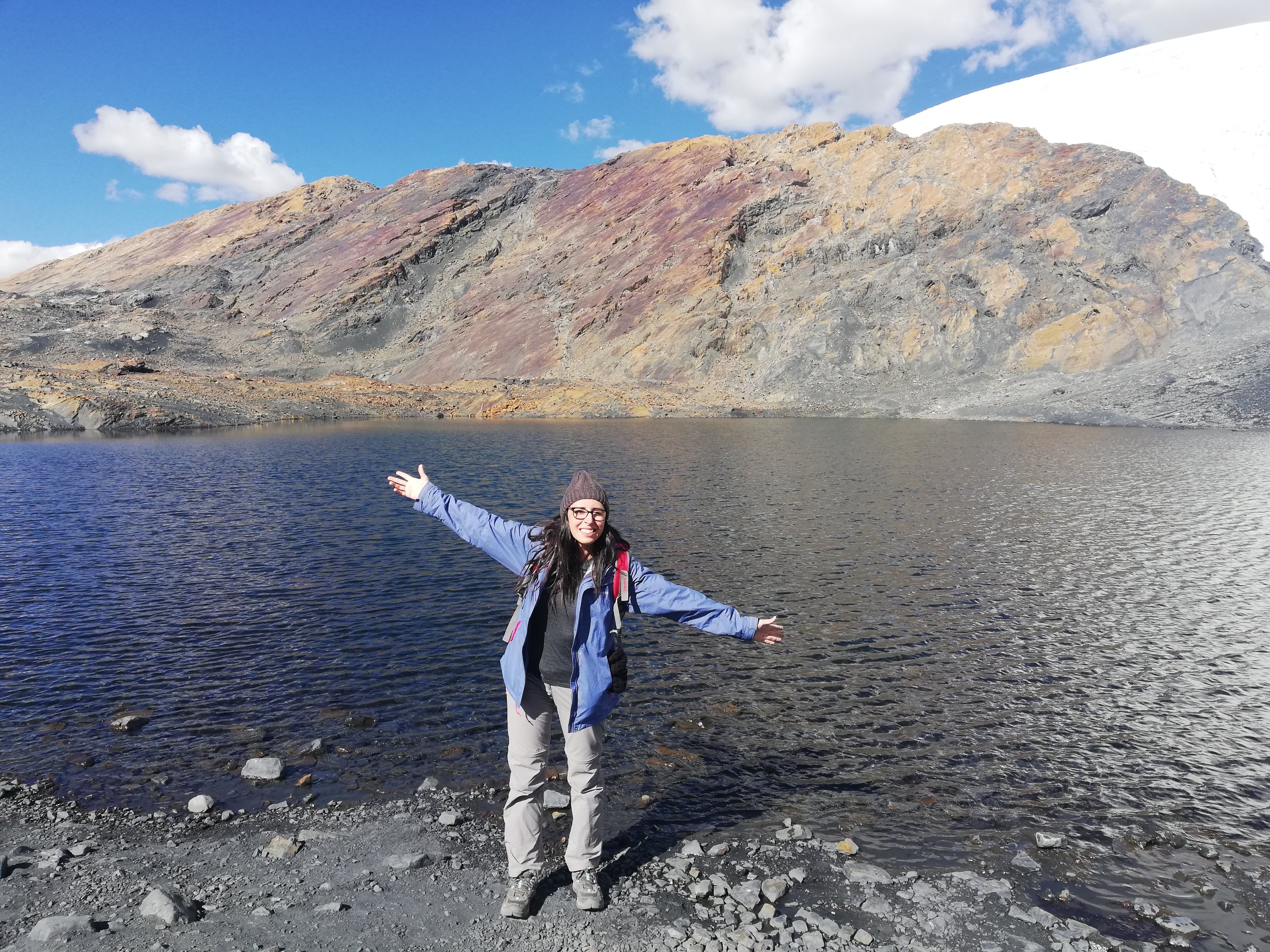 También nos ha mencionado la suerte que hemos tenido de venir ahora que es verano, hace calor y el cielo está totalmente despejado, en octubre es época de lluvias y son muy fuertes, con rayos, truenos… La población tiene miedo porque hay 434 lagunas y 663 nevados.