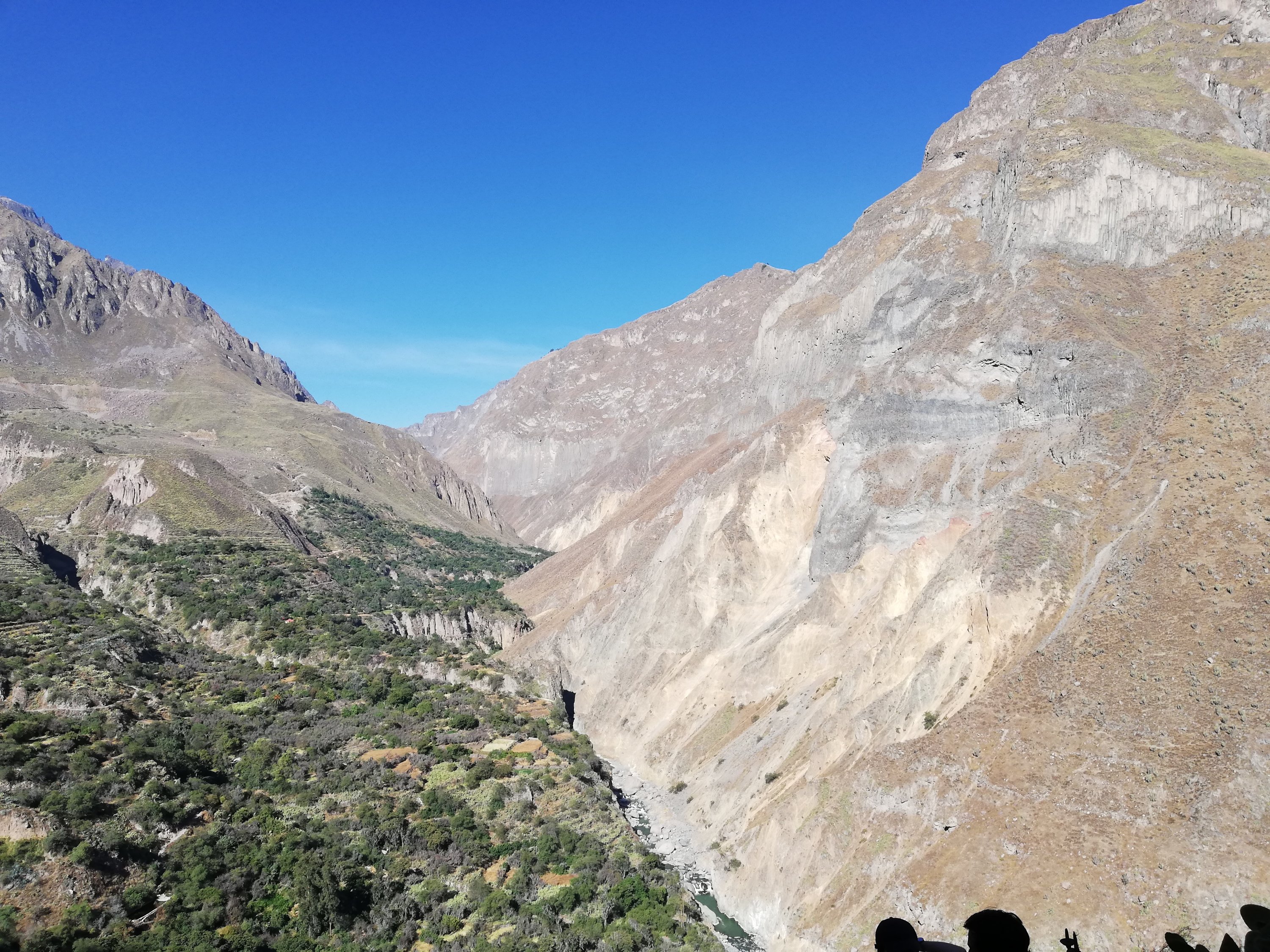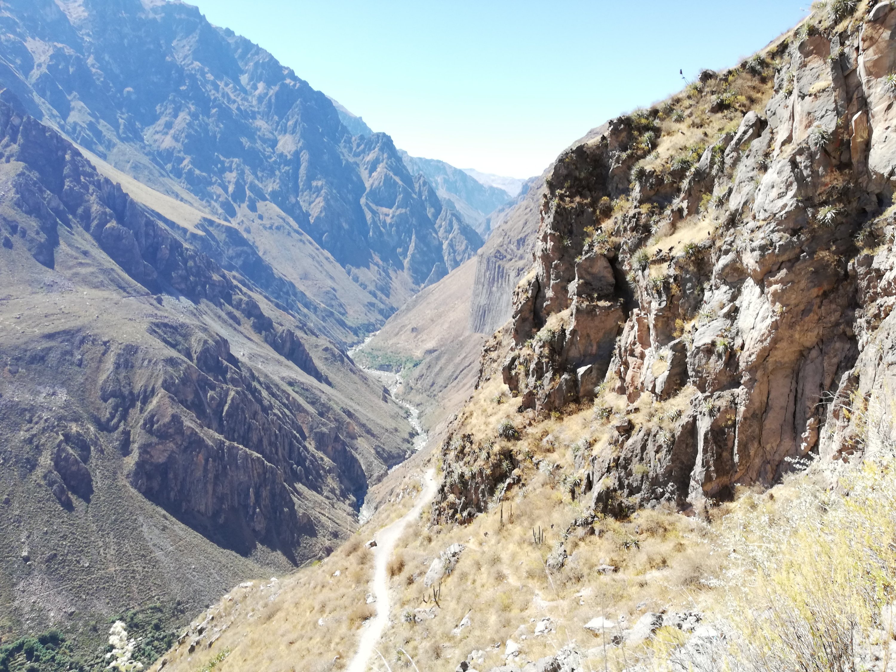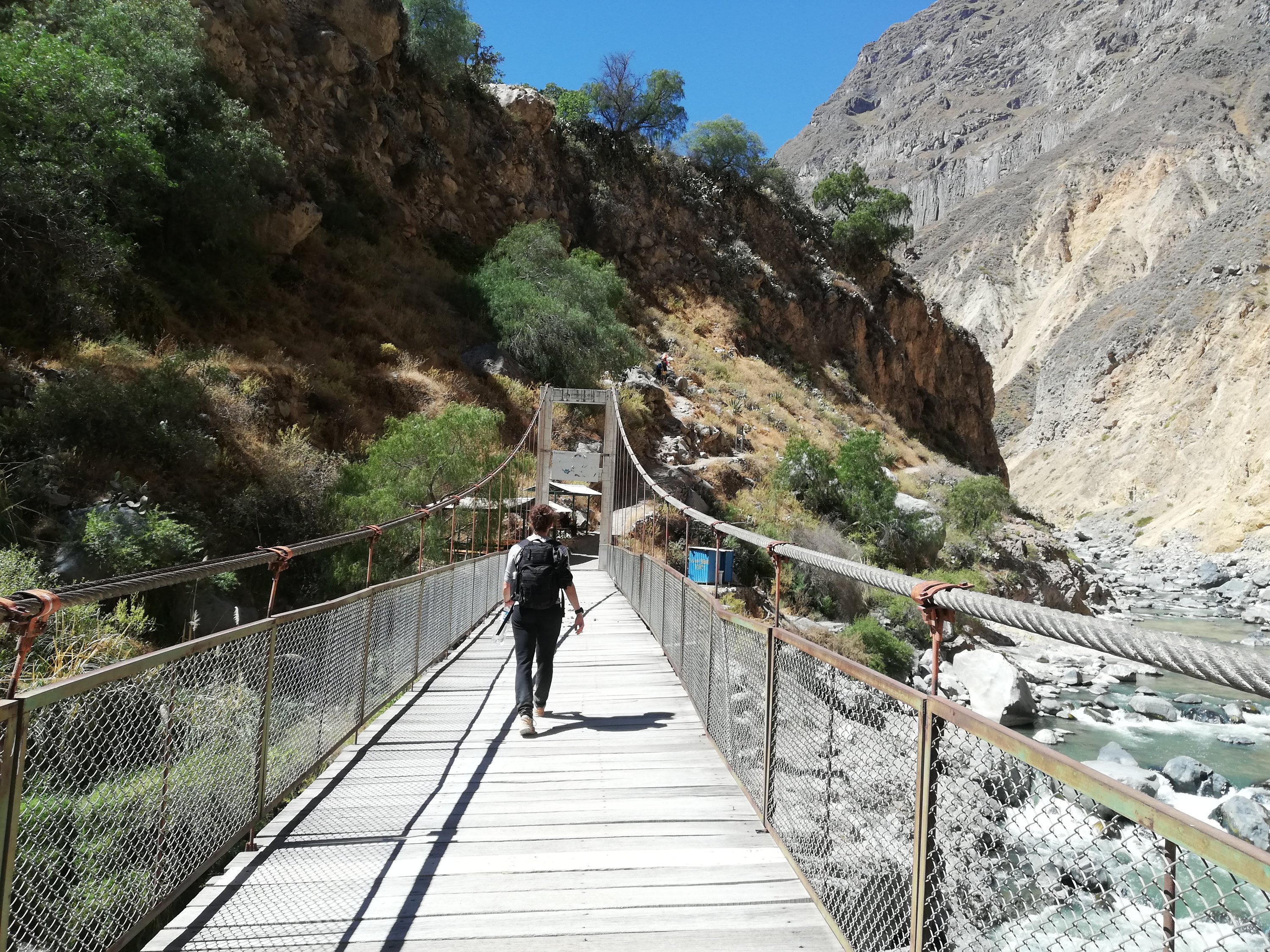 Vamos hacer un total de 13 km, mayoritariamente de bajada. Estamos en un cañón, llamado Colca, en el desierto de Atacama. Es el 4o cañón más alto del mundo con unos 4000m de altitud. Nosotros nos encontramos a 3400 y debemos bajar hasta 2200 para pernoctar. Este cañón está hecho con lava de antiguas erupciones de los volcanes que hay alrededor. Por eso se dice que es de roca volcánica con más de 30.000 años de historia.