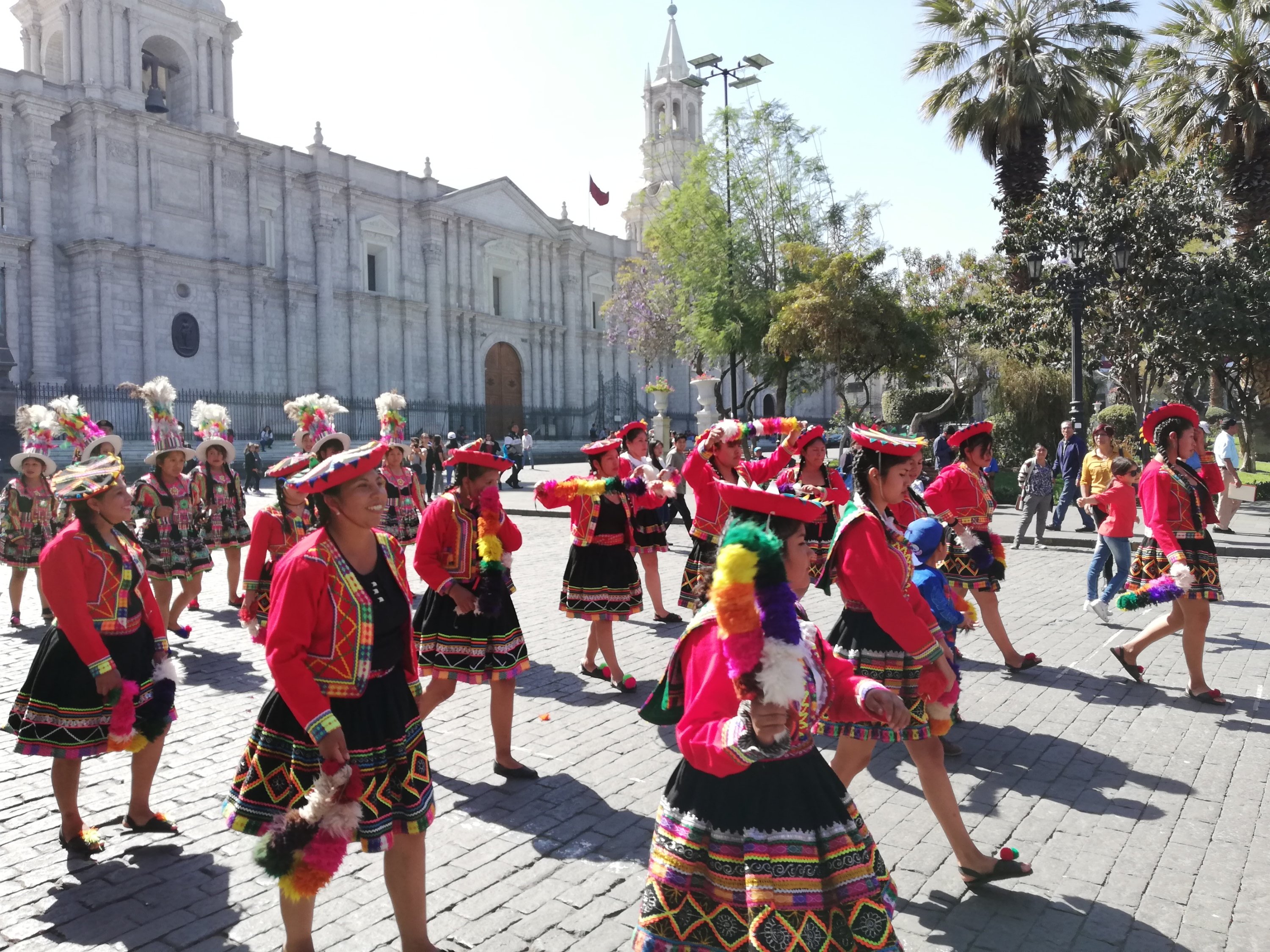 Estamos a escasos 15 minutos y, tan sólo llegar, ya nos percatamos que Arequipa, es una gran ciudad. Su enorme plaza de las armas y la catedral dejan al descubierto dicha afirmación. En la plaza, están celebrando una fiesta en recuerdo a la independencia de Arequipa (parece ser que todos los sitios a los que vamos están de celebración) y hay policías, gente «importante» (o eso suponemos) y bailes y música tradicional.