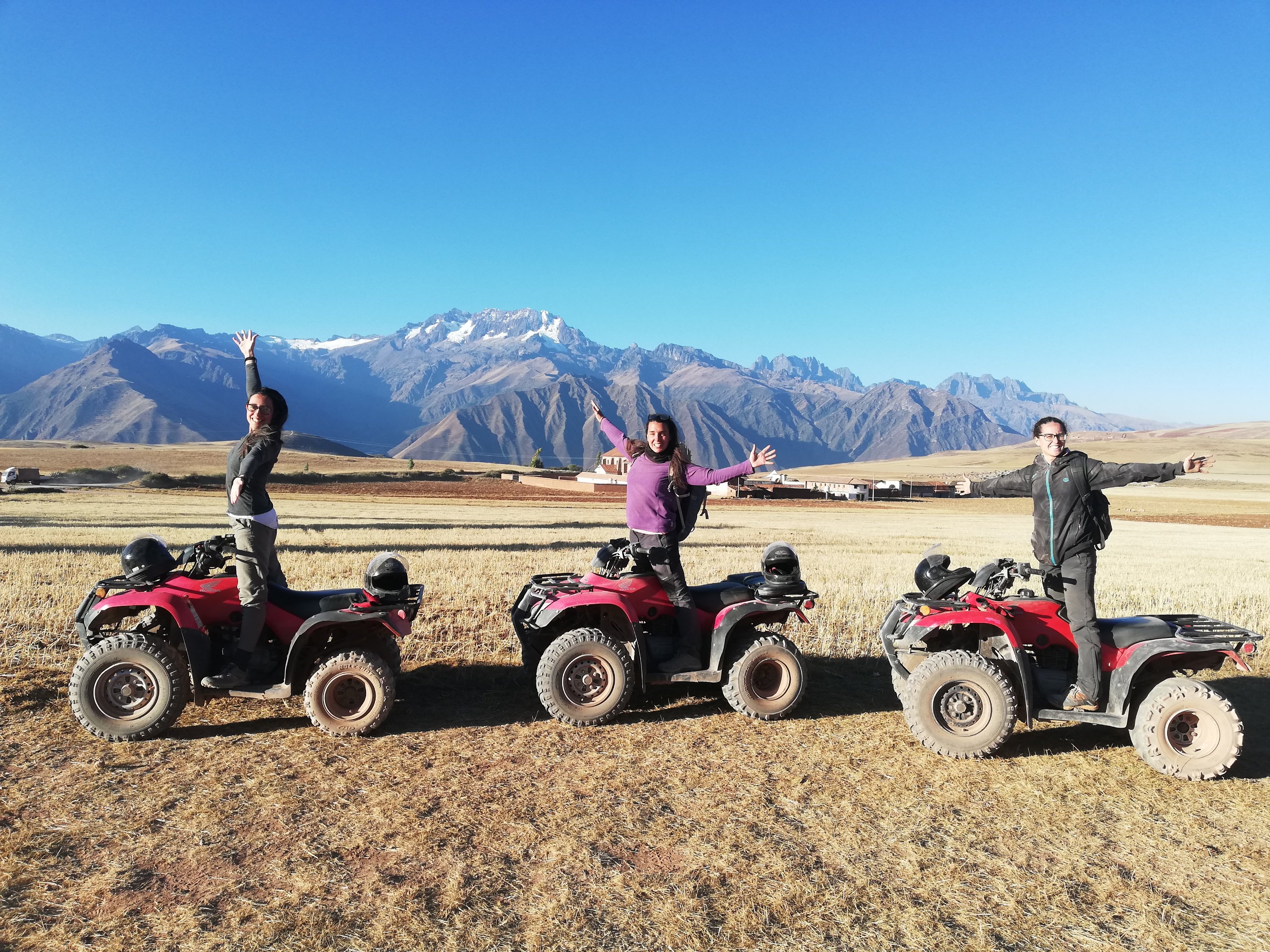 De vuelta a la plaza de las armas, para ahora verla iluminada y con sol. Suerte del sol que nos calienta. Helena y José se han quedado en un banco desbancando mientras Cris y yo hacíamos negocios con otras agencias. Pensamos que una buena opción es hacer una excursión en quad y ver las salirenas. Comparamos y precios y buscamos el hostal de nuestro buen amigo Jimmy donde acabamos contratando los quads para el medio día.