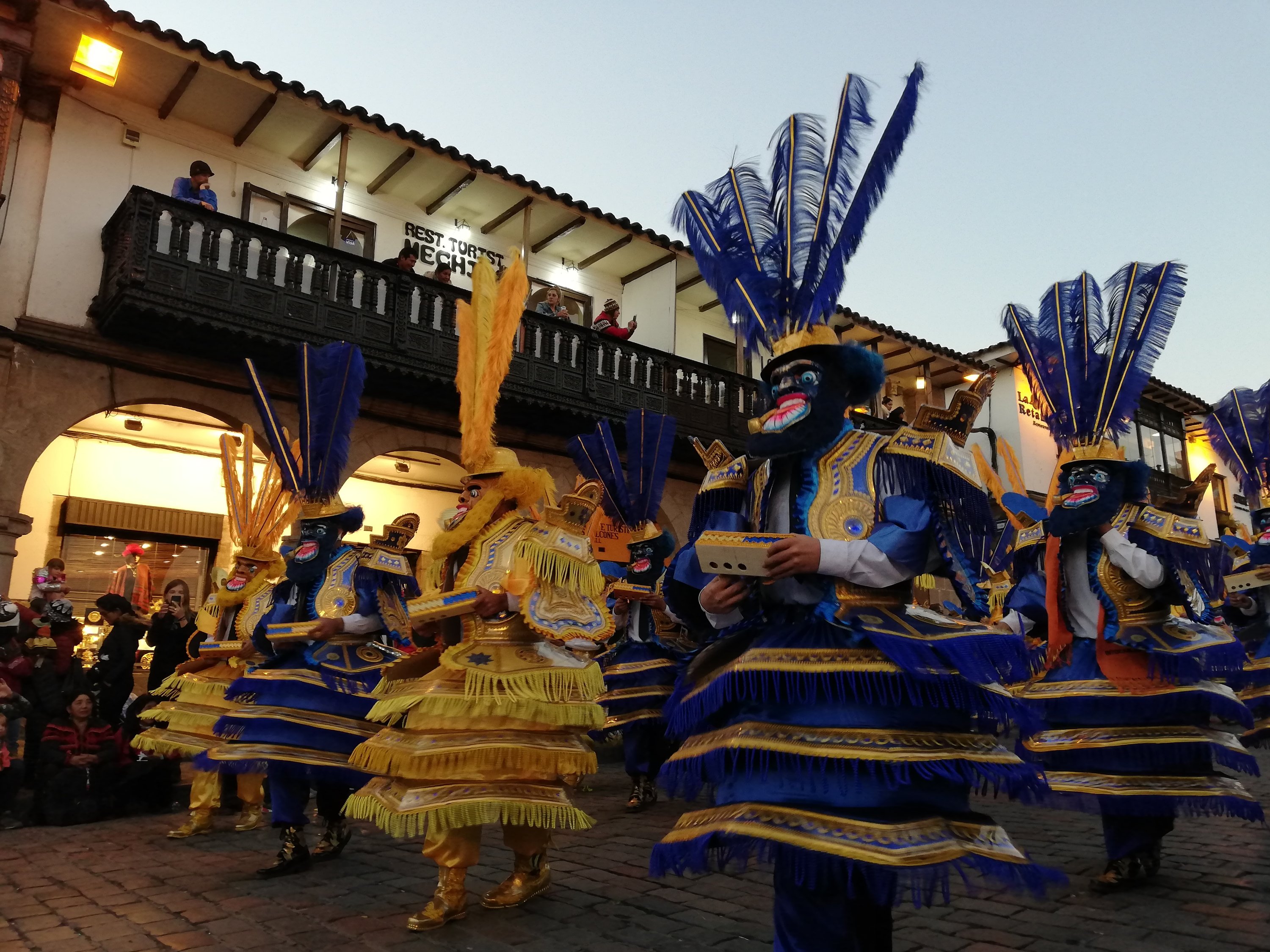 Cogemos taxi hasta el centro y desayunamos en la repostería a la que fuimos hace días. Chocolate caliente y croissant de chocolate para endulzar la mañana.Buscamos donde alojarnos. Vamos a quedarnos un día más pues como es tarde nos hemos perdido la excursión q salía a las 8.30 de la mañana y como no vamos a regresar a Cuzco, preferimos hacerla hoy, así pasamos un día más con Iñaki. Cogemos una habitación para los tres en el centro. Cris i José aprovechan para dejar las maletas (ellos se van esta tarde) y callejeamos en busca de algún recuerdo o alguna pieza de ropa que valga la pena.Acabamos comiendo en un restaurante céntrico, la última comida los 4 y a las 17.15 nos despedimos de ellos. Tristes pero con una sonrisa de haber vivido unas vacaciones memorables, se marchan vuelo hacia lima para mañana a primera hora volar hacia España. Hasta pronto amigos!!Nosotros aprovechamos para dar una vuelta y tomar una cervecita. Aparte son fiestas en Cuzco y la b te va disfrazada haciendo bailes con niños y adultos!!