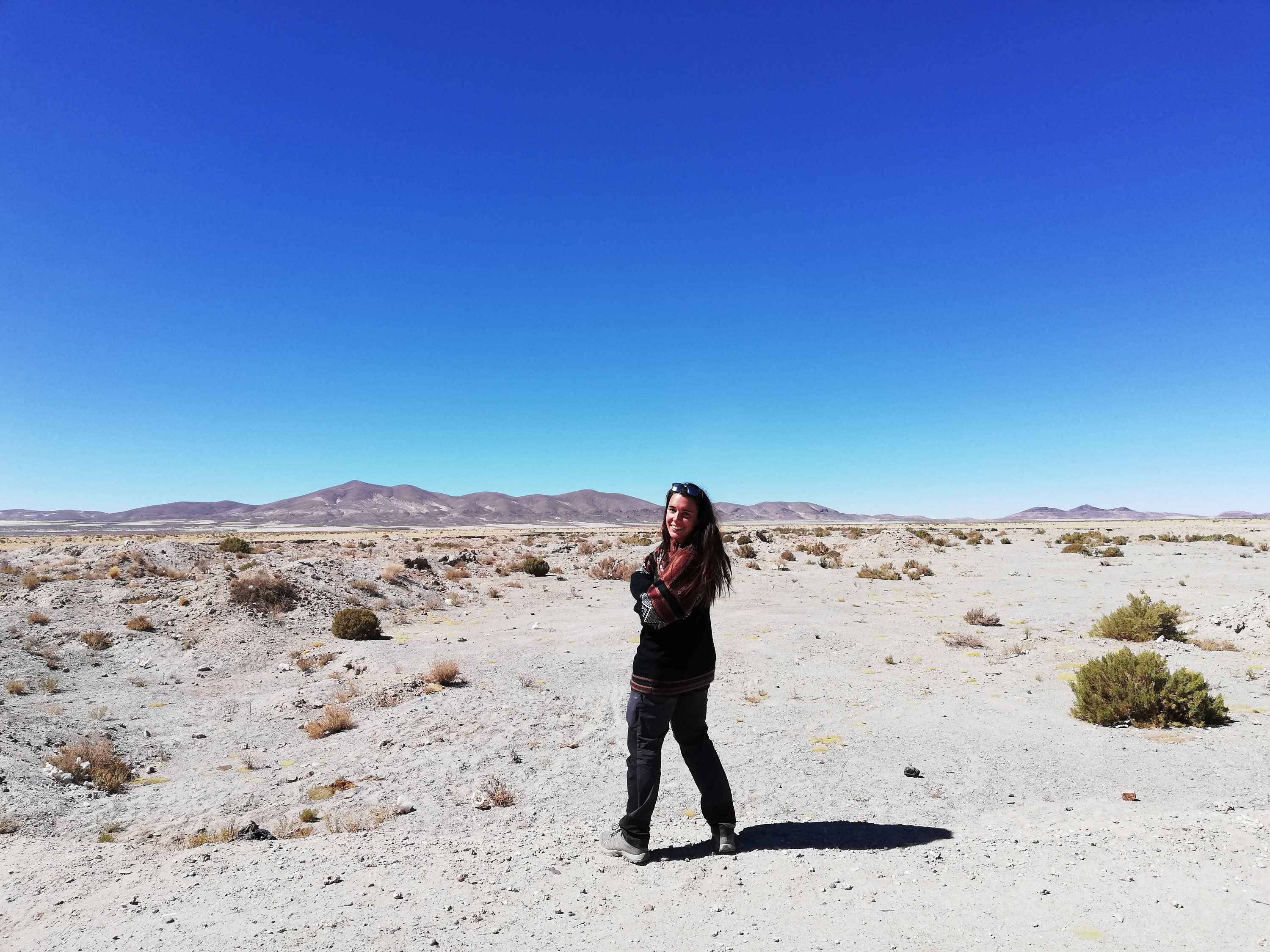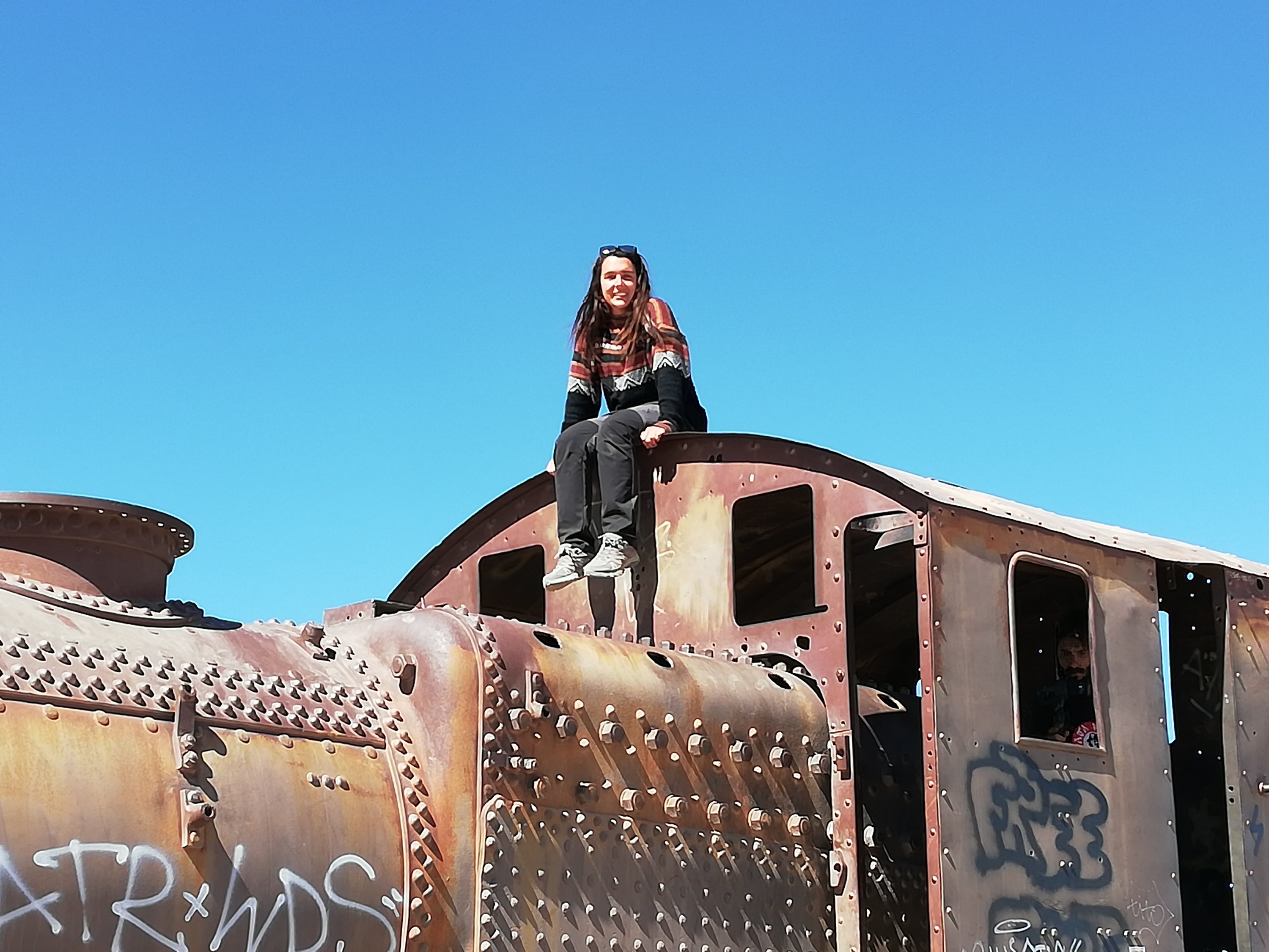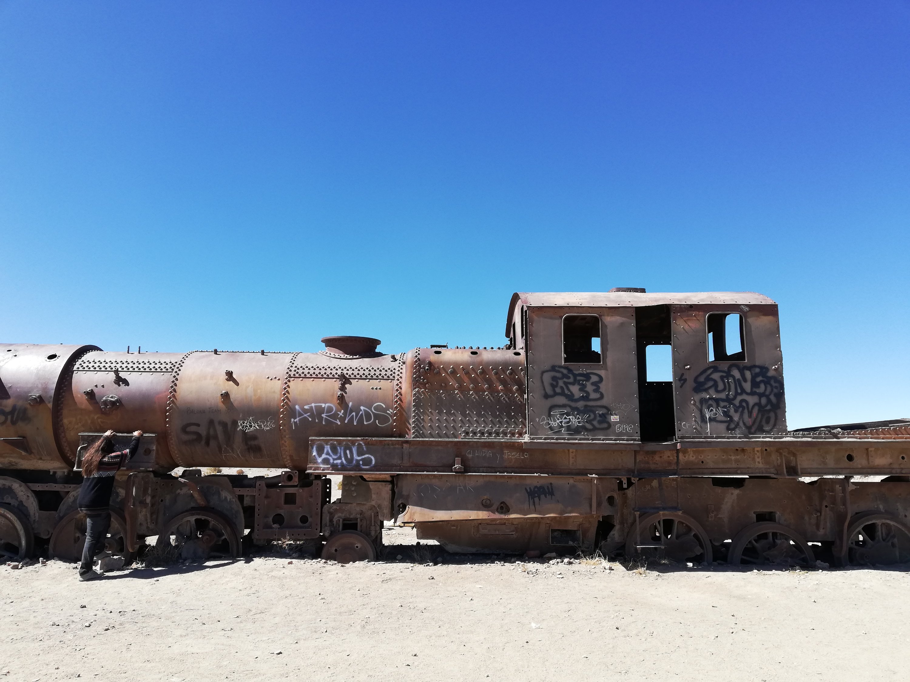 A las 10.30 estamos puntuales y tras esperar varios minutos llega nuestro 4×4 juntamente con otros pasajeros. Nuestro guía se llama Roberto y, muy simpáticamente nos explica el recorrido que vamos ha hacer.La primera parada la hacemos al «cementerio» de trenes, donde encontramos gran variedad de ferralla y, donde al parecer, se ha hecho un lugar turístico.No íbamos a ser menos así que buscamos alguna parte de tren que esté en buen estado y hacemos fotos. Roberto nos cuenta que esos trenes transportaban minerales a Chile. A día de hoy, se sigue haciendo pero con una máquina más nueva y sigue pasando por las mismas vías de antaño.