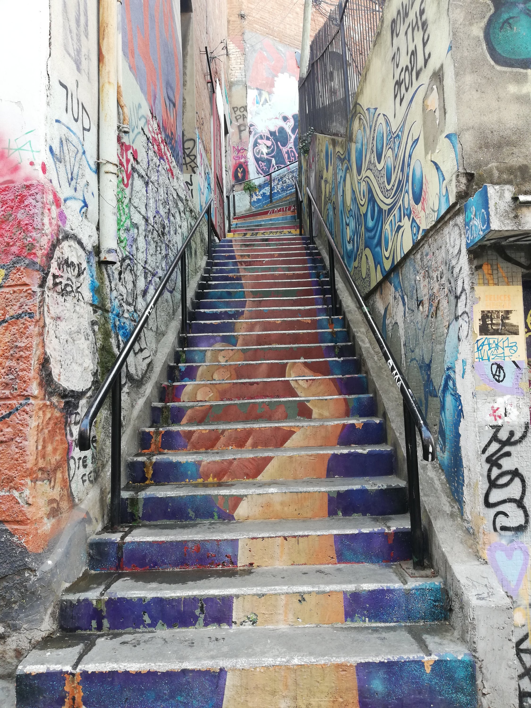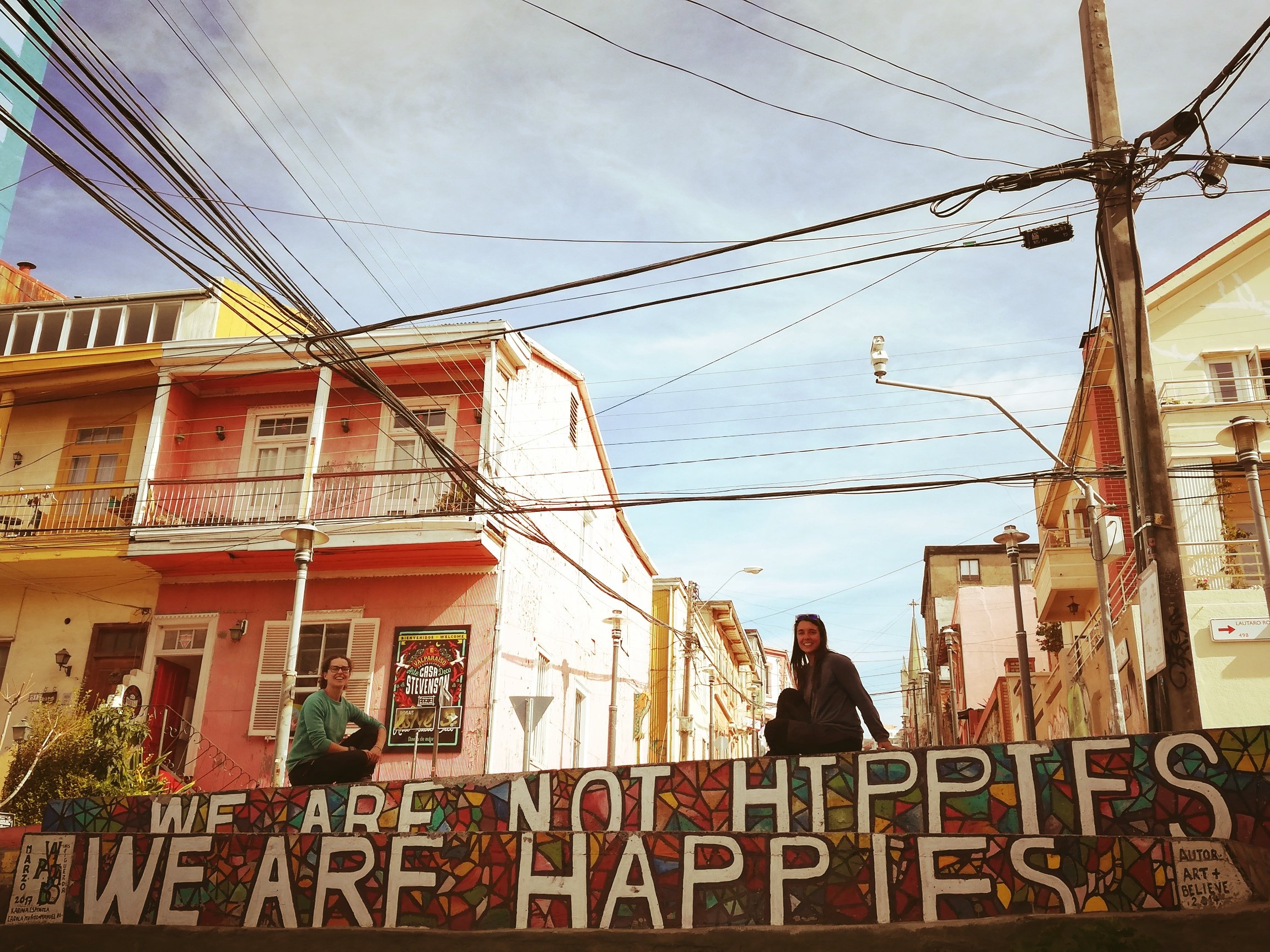 Las casas, las calles, los colores… Empezamos a callejear, cuesta arriba y, a medida que avanzamos, observamos murales en las paredes. Esto sigue hasta cerro Concepción. Nos fotografiamos con sitios emblemáticos de la zona, como son las escaleras de Beethoven, la frase «we are not hippies we are happiest», otras escaleras que su dibujo muestra unas manos cogiendonse… Hay que decir que, para poder encontrar estos lugares hemos tenido que tirar de maps y de información encontrada a través de página web…