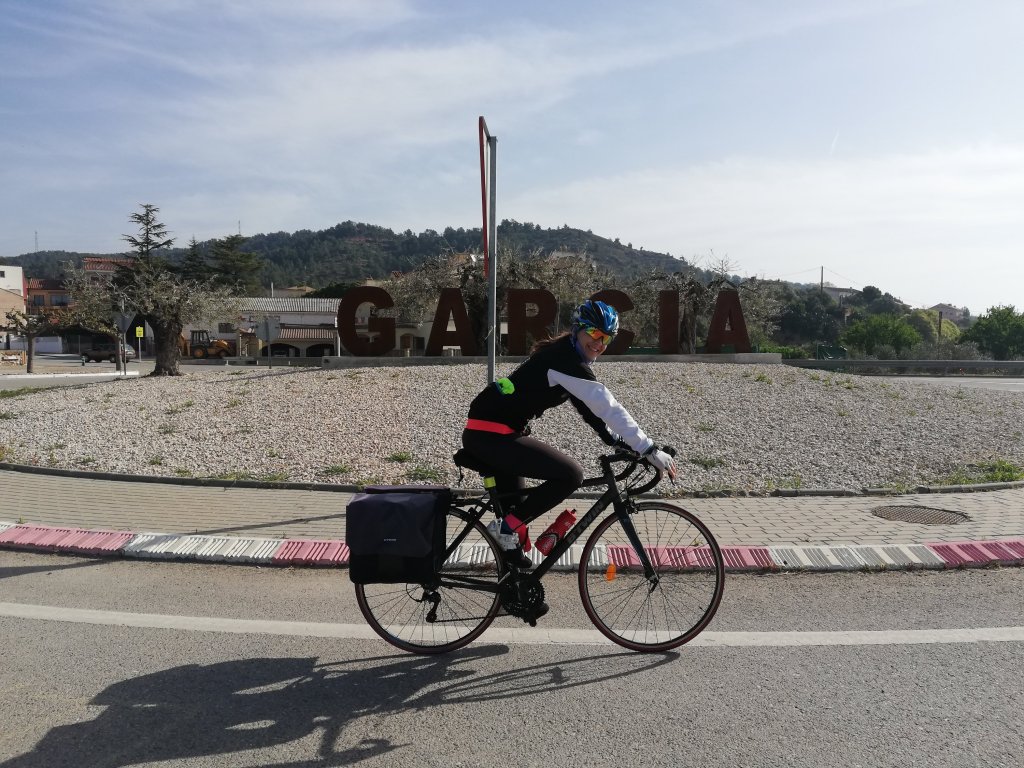 Paramos en un pueblo llamado García , en honor a la madre de Mireia y seguimos pedaleando hasta llegar a Flix donde, a partir de aquí, nos toca una larga subida con 300 metros de desnivel hasta Maials.