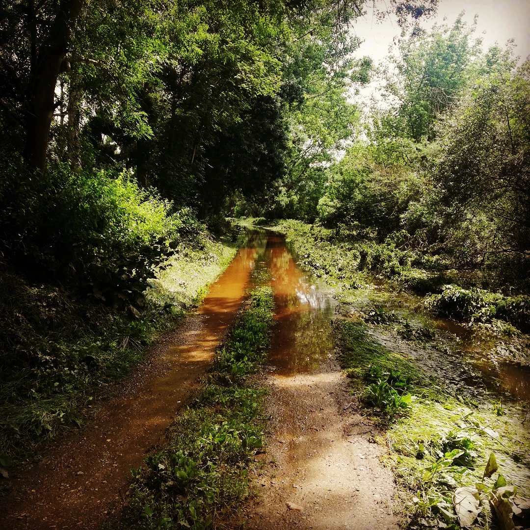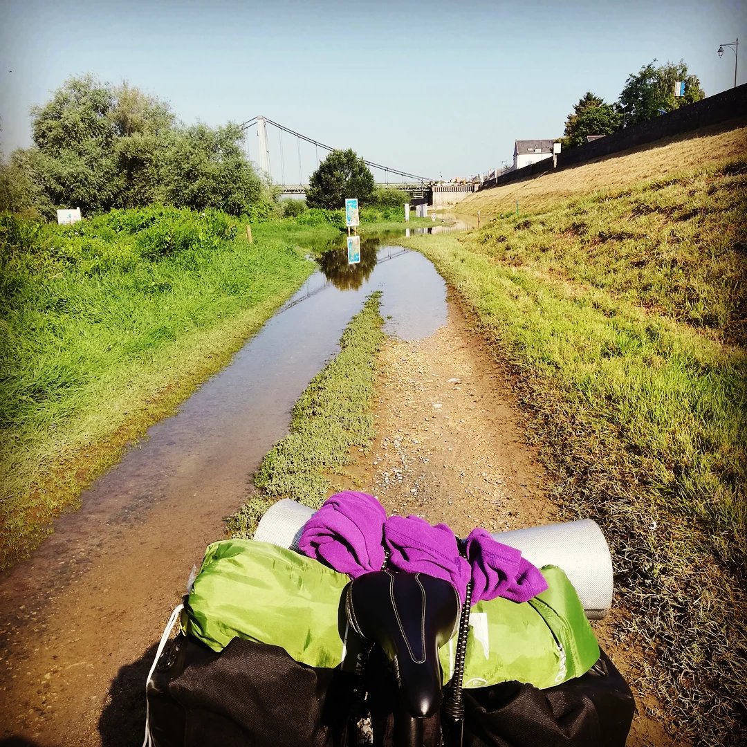 Todo iba bien hasta que tomamos un «atajo». Dicho atajo nos mete por un camino (al principio precioso) pero que luego nos va regalando charcos de agua hasta acabar pasando por encima del mismísimo afluente del Loira. Agua hasta casi las rodillas y seguíamos pedalenado. Pies empapados pero, aunque suene surrealista, nos lo hemos pasado bien. Los franceses ponen carteles donde indica «camino inundado». Lo hemos visto en muchos otros caminos, menos en el que hemos cogido, jajaja.