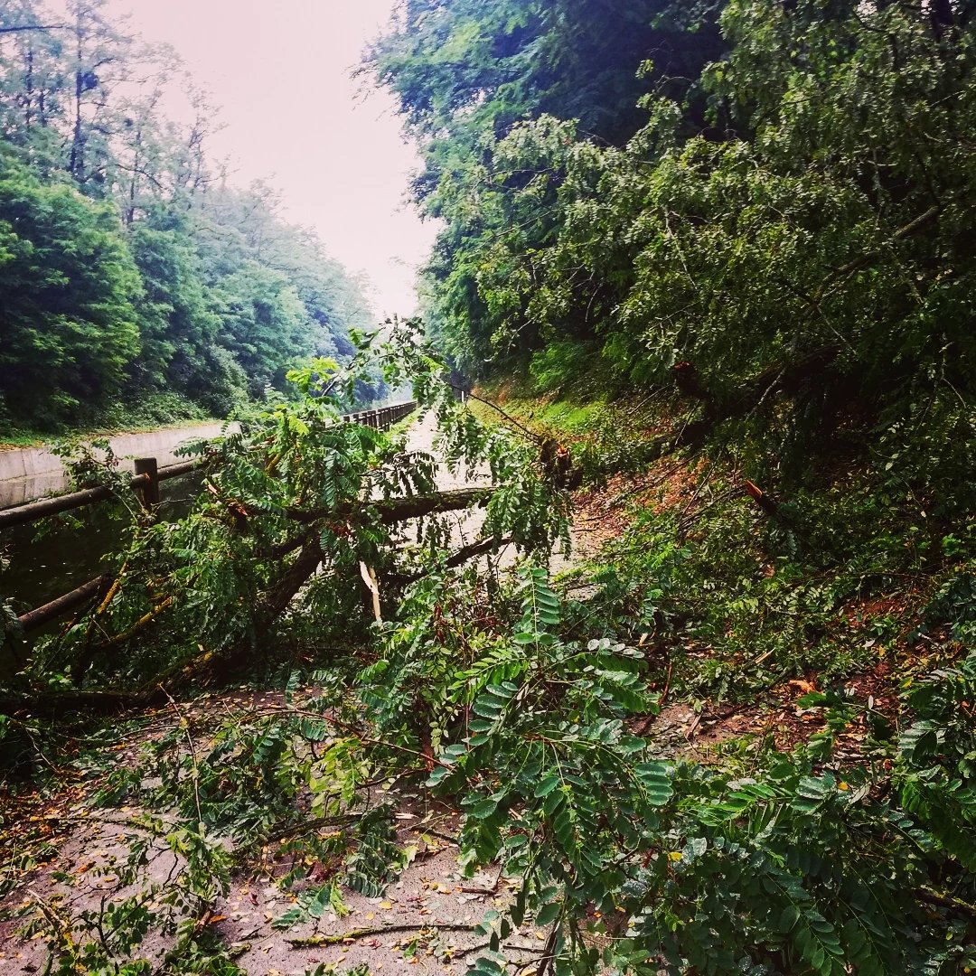 He empezado a pedalear y, durante el camino, he ido observando que el temporal de anoche había sido más duro de lo que pensaba. El camino estaba lleno de árboles caídos y imposibilitaba mi paso. Aún así, me he armado de valor para cargar con la bicicleta y cruzarlos. Luego, por suerte, tenía una forgoneta delante que iba talando los árboles para que pudiera pasar.