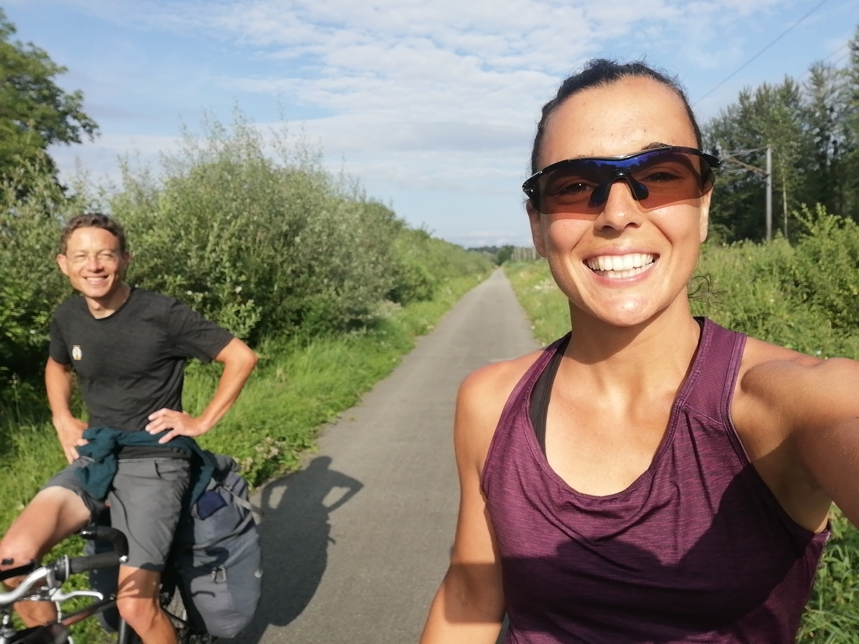A las 7.30 empiezo a pedalear y a las 8 me encuentro con Aurélien. El trayecto discurre al lado del río. En algún momento atraviesa poblaciones y son escasas las veces que el camino hacia subida. (aunque hay que decir que cuando sube, se nota bastante…).