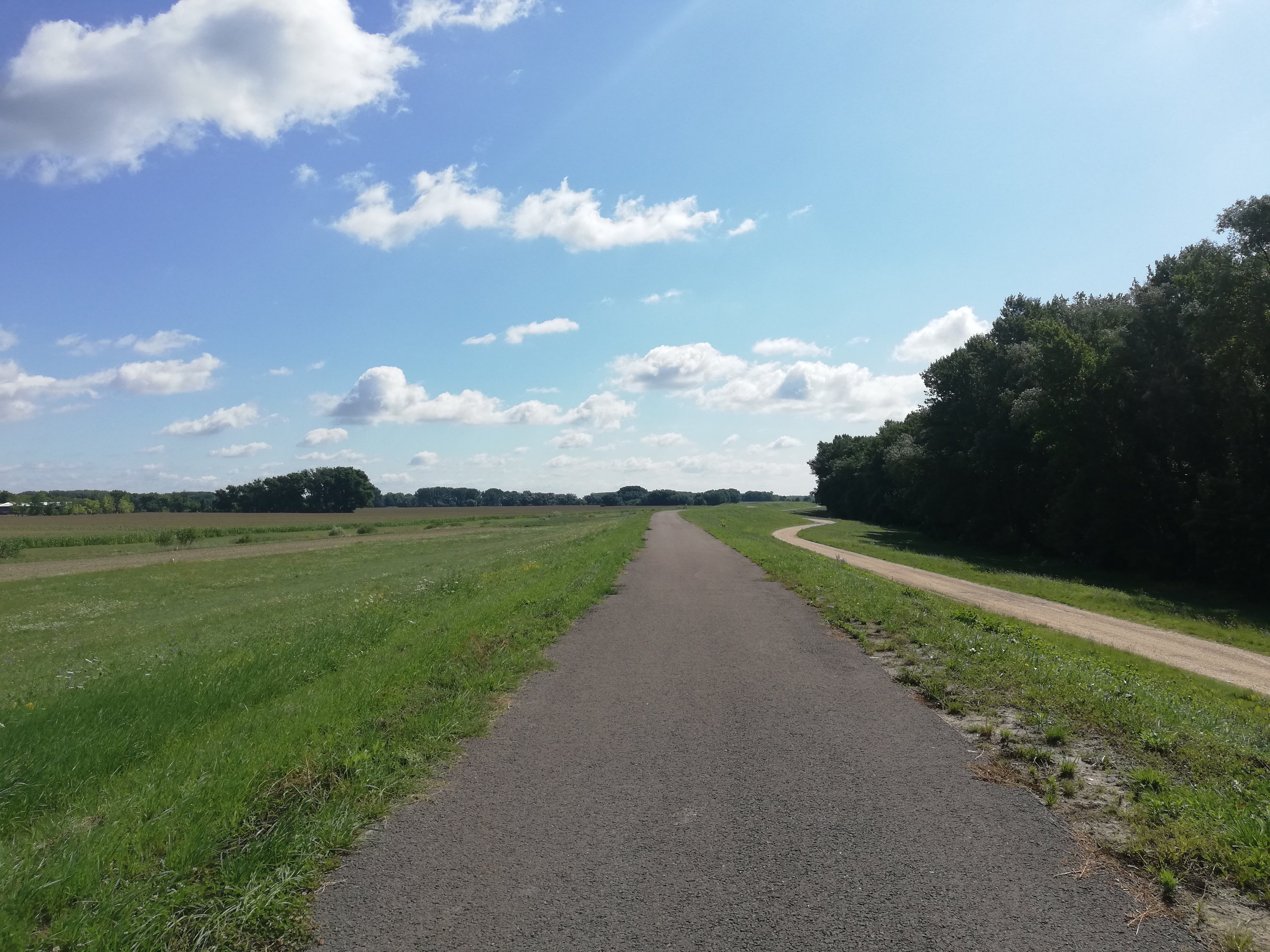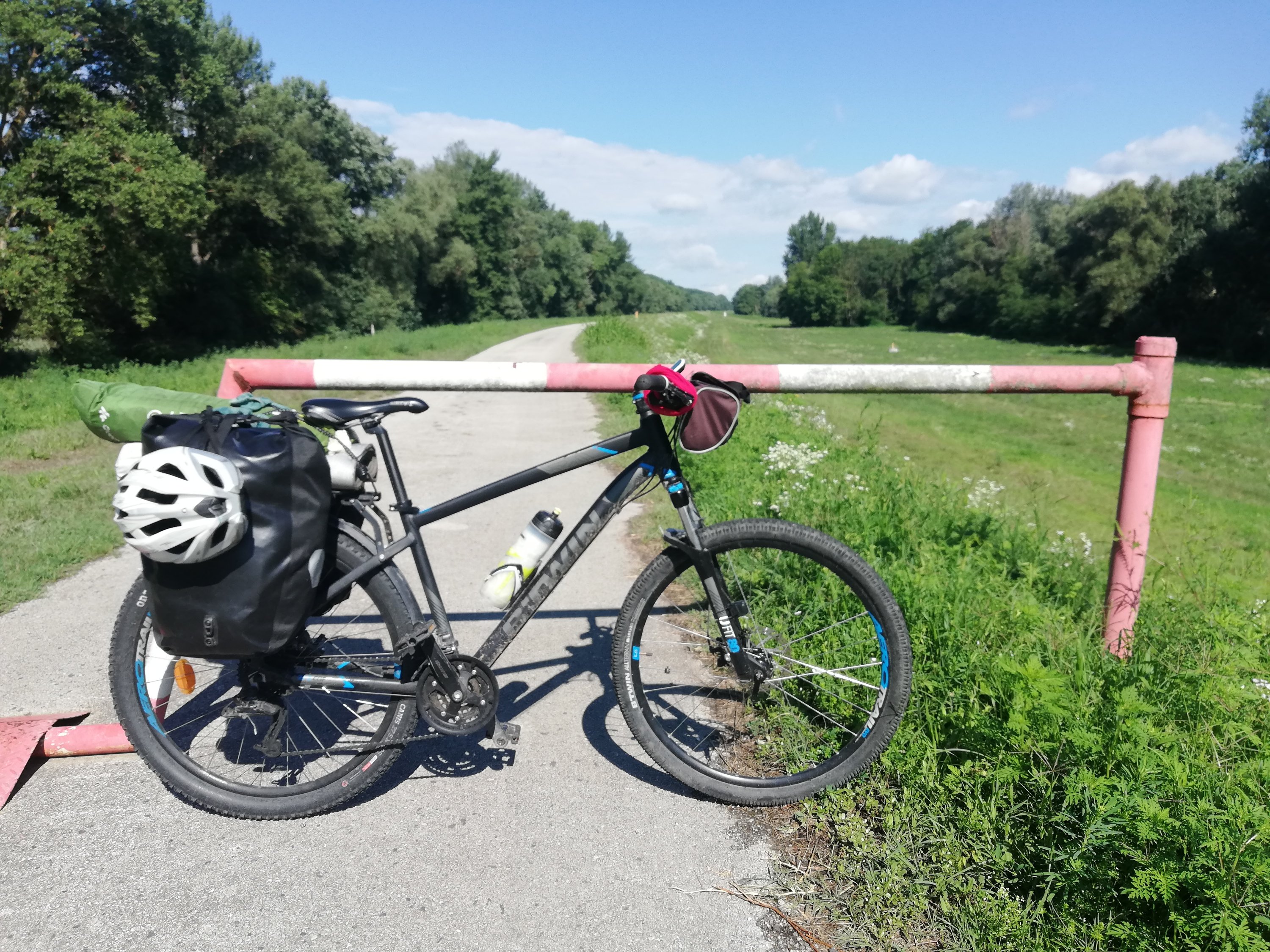 6.45h empiezo a pedalear. La salida de Bratislava ha sido un poco caos. Pocas indicaciones, calles en obras… Al final me he metido por un camino y he conseguido llegar (no sé como) al camino correcto. Tras el pequeño rodeo estoy en la dirección que toca, con viento a favor. El suelo está asfaltado, es fantástico!! Pedaleo junto al río en línea recta y con un firme espectacular. El viento en mi espalda me ayuda a avanzar muy rápido.