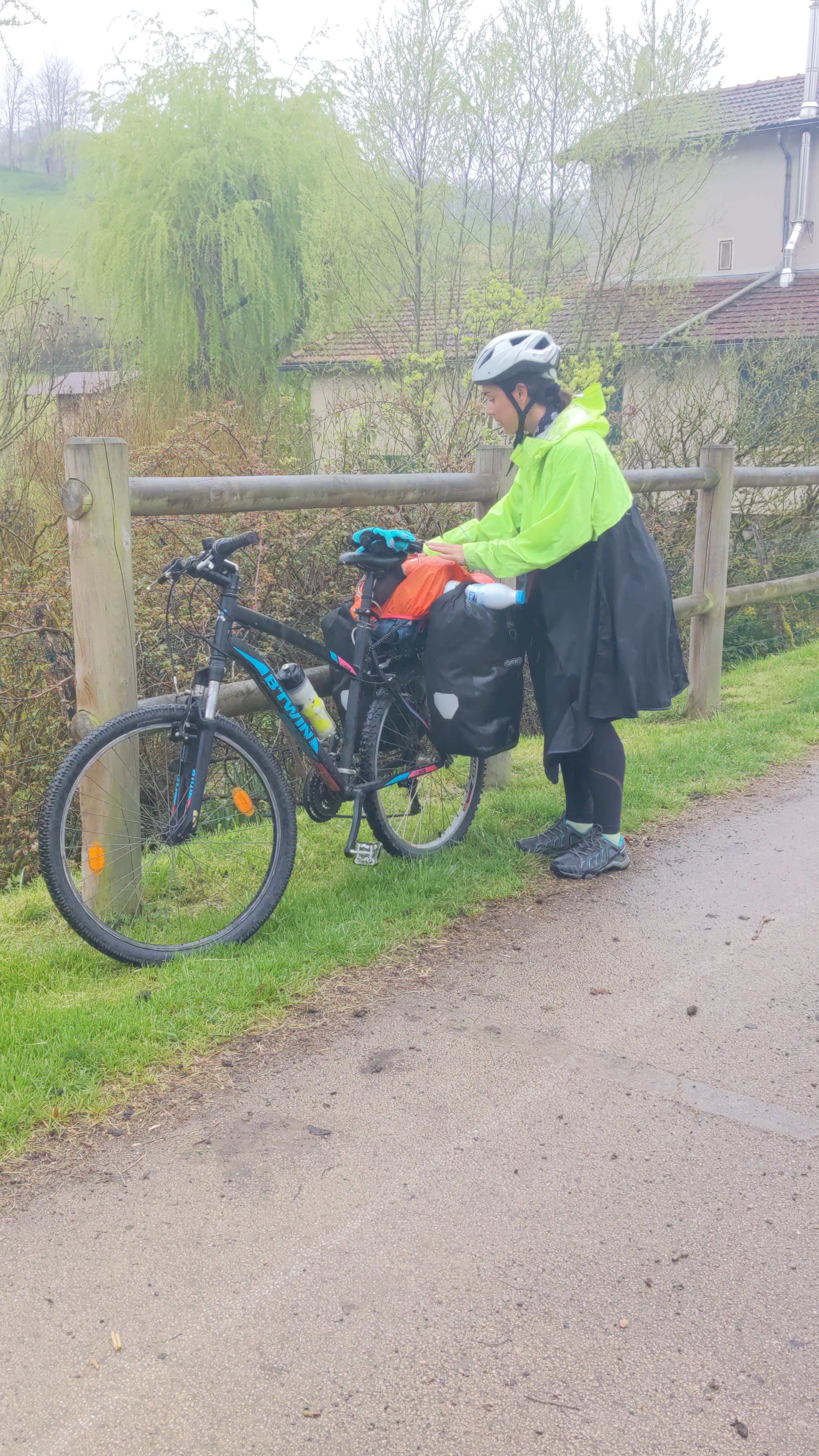 Chaqueta, chubasquero, guantes y casco. Todo listo para empezar el día. Salimos de Saint Girons por la carretera para coger una pista ciclable que nos llevará hasta Foix. La pista, en perfectas condiciones nos acompaña todo el trayecto. Hacemos varias paradas para desabrigarnos, sacarnos el chubasquero, volverlo a ponerlo y así sucesivamente.