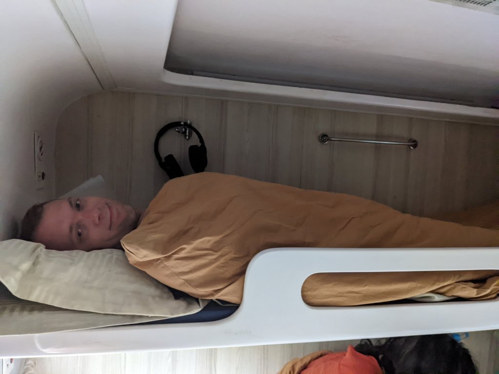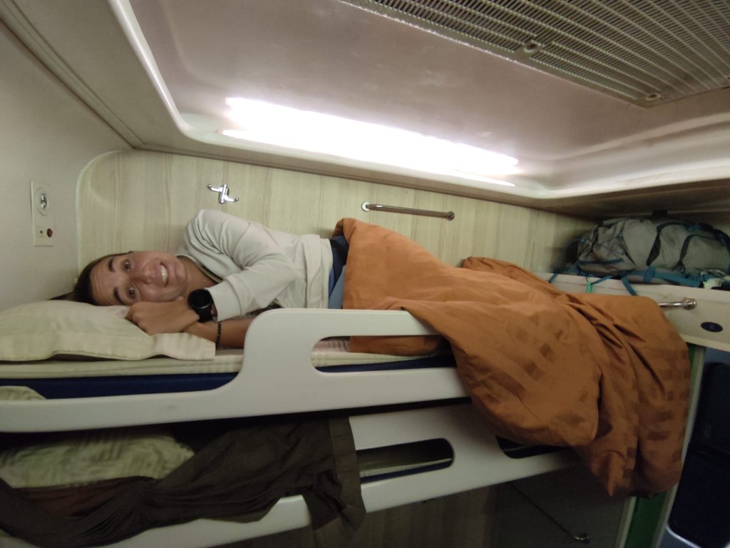 La noche prometía. Nos esperaban 14 horas de tren en una cabina diminuta dónde entraban 6 personas. Dos literas triples por banda, de escasos 50 centímetros de ancho. Óscar y yo, dormíamos en la misma cabina, en la litera más alta, sin la posibilidad de permanecer sentados en ningún momento pues teníamos el techo encima. Sara y Cris, en la cabina de al lado, se encontraban en las mismas condiciones.