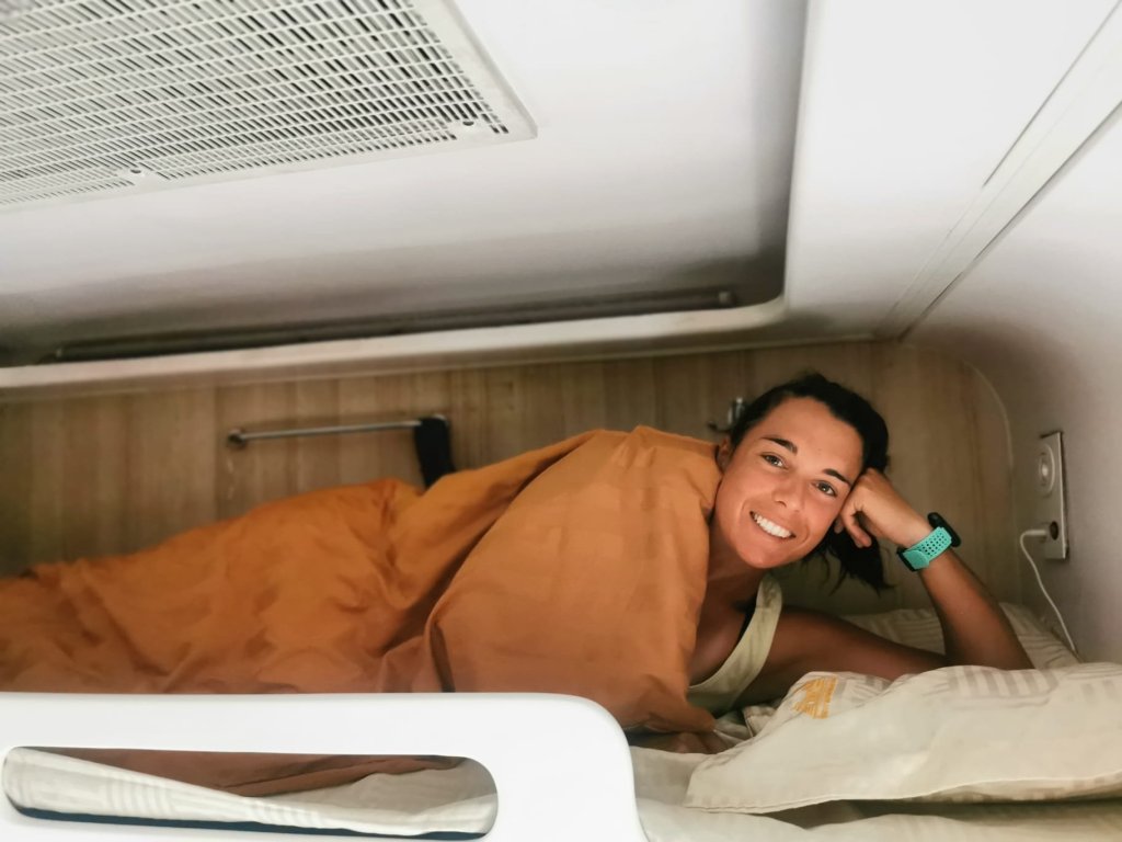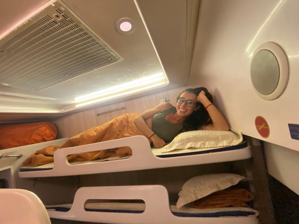 Instalados en lo que sería nuestras siguientes 14 horas, nos tumbamos. Hay un cojín y una especie de edredón que debe haber usado bastante gente antes, aunque no se ve sucio. Tenemos un enchufe para cargar los dispositivos electrónicos y una pequeña luz.