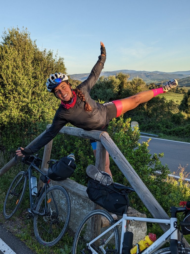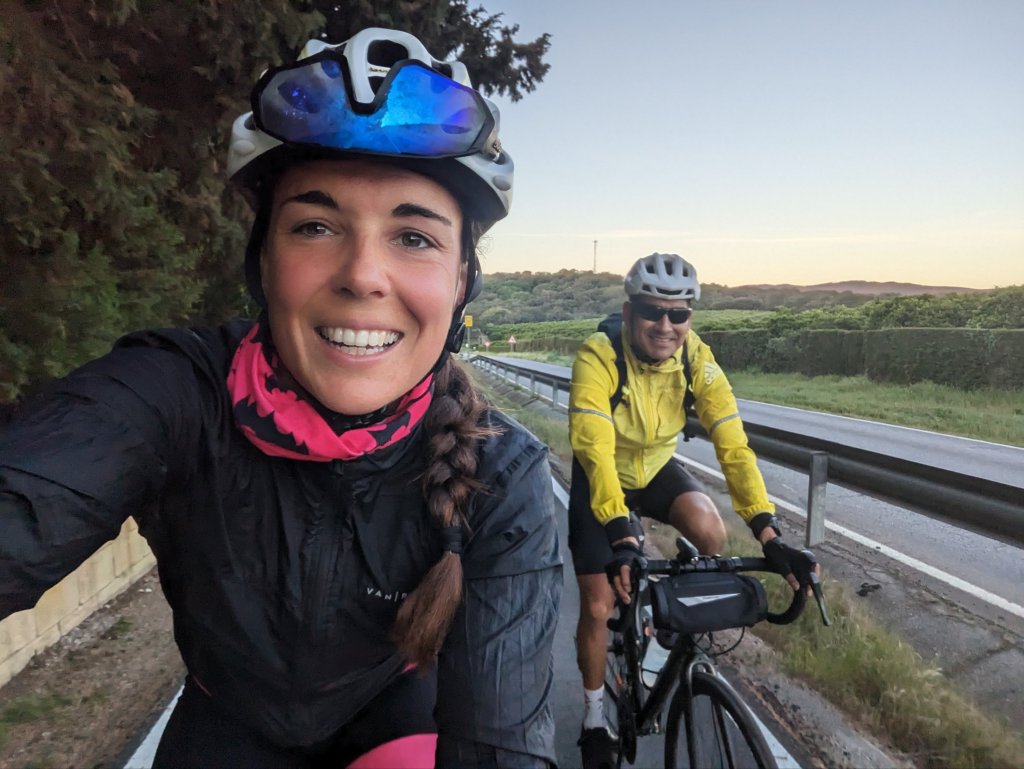 Los primeros 20 km los hemos hecho por una vía ciclista paralela a una carretera secundaria. El día se despertaba a ritmo de nuestro pedaleo y la primera subida se ha hecho bastante llevadera viendo el amanecer.