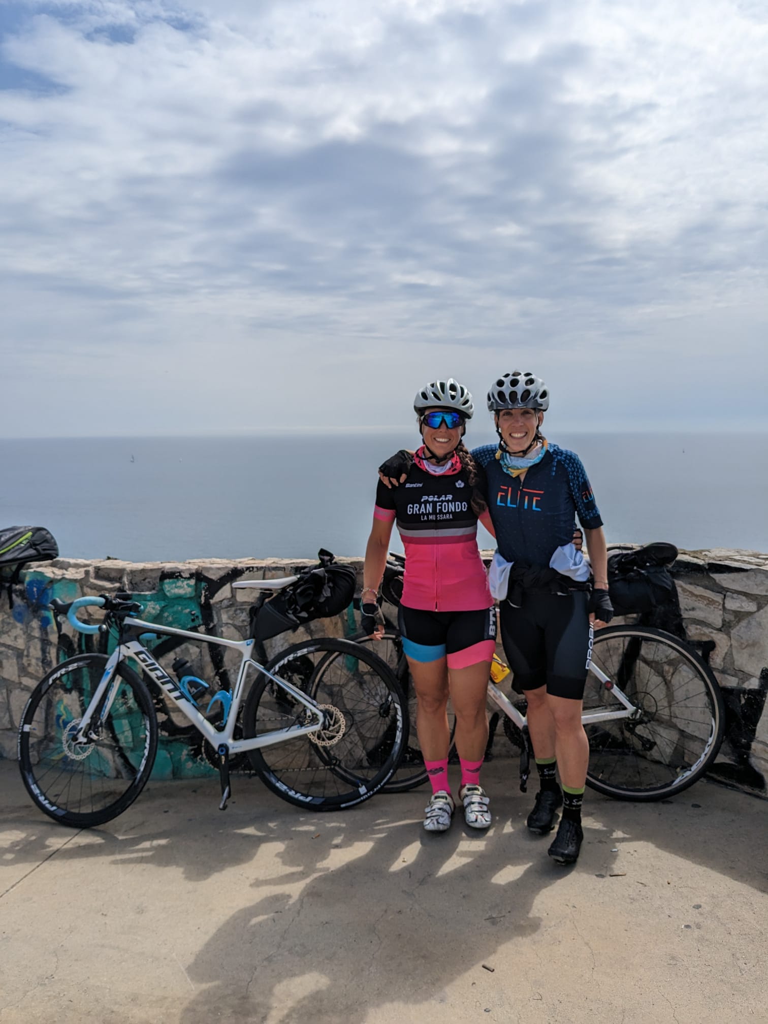 Pasadas las 12.30 del medio dia nos plantamos en Sitges. Toca hacer la carretera de curvas antes de llegar al Garraf, así que nos adentramos y pedaleamos tan rápido como podemos. La verdad es que llevamos un buen ritmo y se nos hace bastante llevadera. Hay tráfico (pero como siempre) y eso no nos impide el pedalear con gusto. En uno de los últimos miradores, paramos para hacernos la foto de rigor y seguir hasta casa.