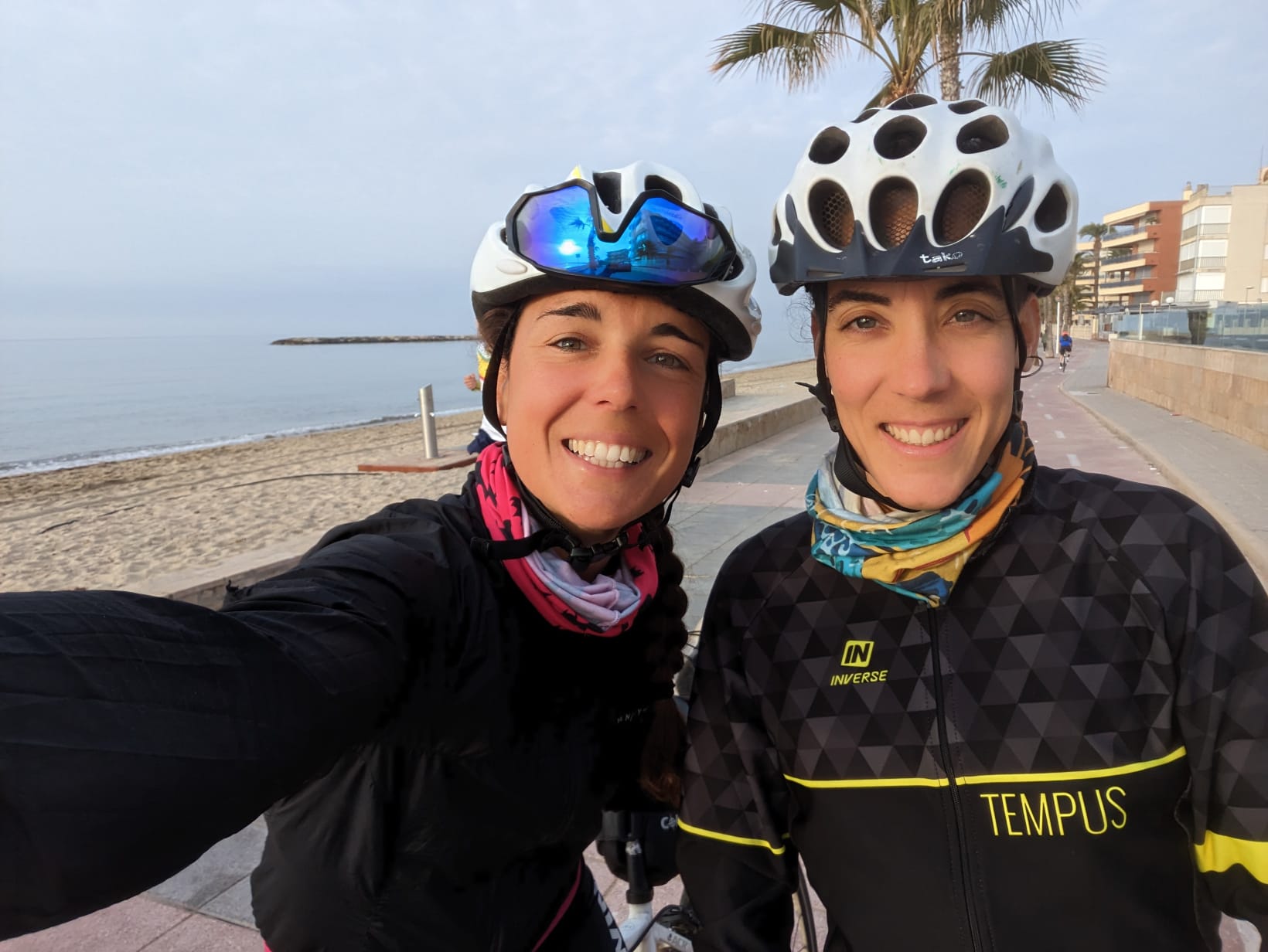 Salimos de Cambrils a las 8.15 de la mañana, pedalendo por el carril bici del paseo marítimo hasta llegar a Salou donde, de golpe, noto como se me desincha la rueda. He pinchado (pienso) pero al desmontarla y comprobar si hay algo puntiagudo que pueda volver a causar otro pinchazo, Aida se da cuenta de que la cubierta está rajada. Qué mala suerte! La última etapa y en un dia festivo… no puedo comprar ninguna cubierta y tenemos 110 km hasta Barcelona. Decidimos hacer un apaño rápido. Cojo la navaja, recorto un trozo de la cámara pinchada y la ponemos a modo de base para que no salga por el lado la cámara nueva. A ver cuánto aguanta!.