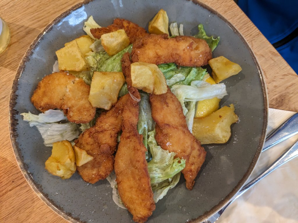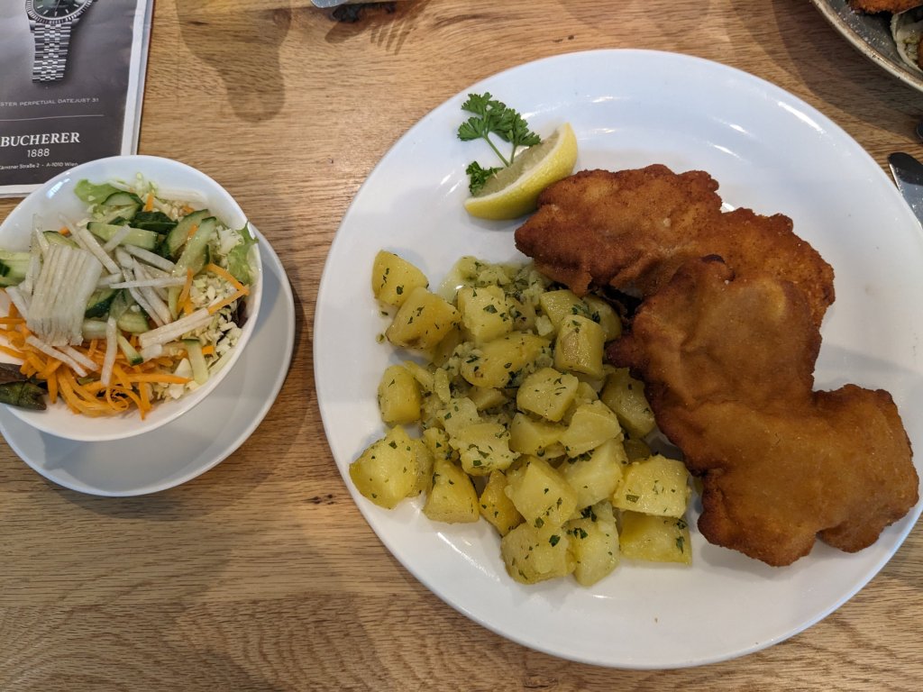 Hemos acabado comiendo a las 16:15h en un pequeño restaurante del centro. Por 15 euros teniamos un plato con ensalada, patatas y carne rebozada. Es un plato típico de Austria aunque no deja de ser una milanesa de toda la vida (Wiener Schnitzel).