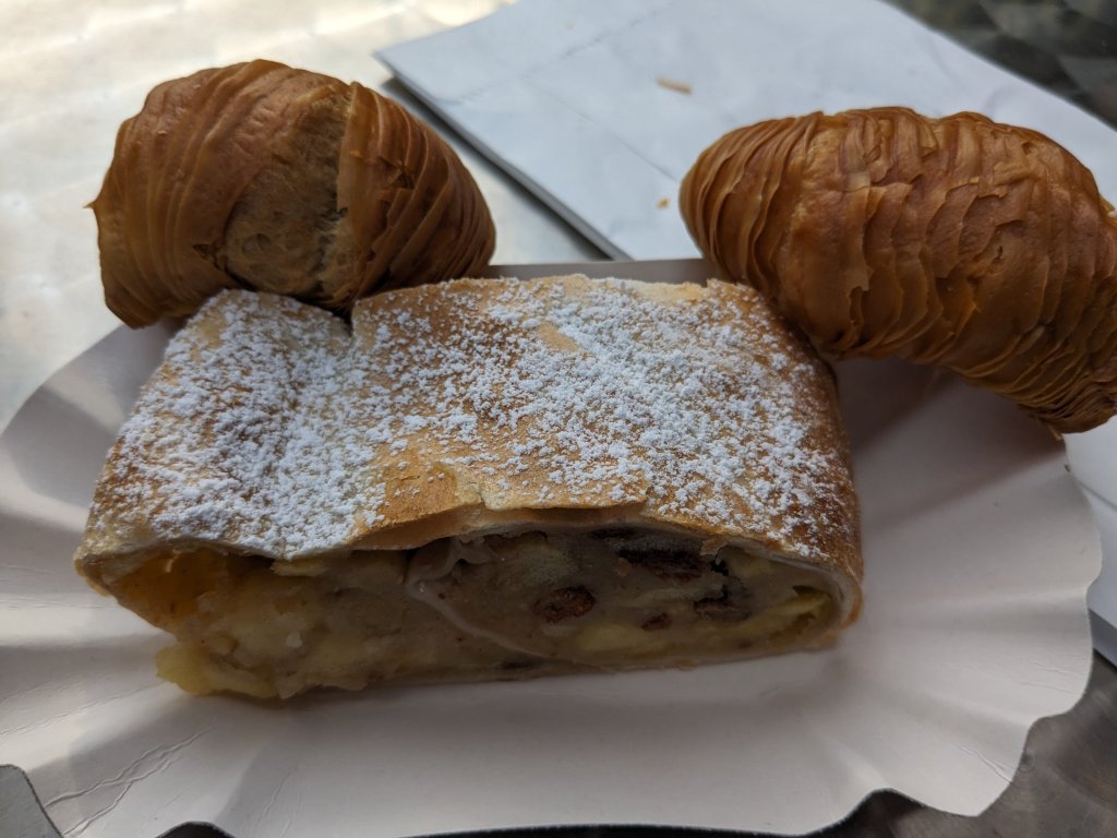 Luego teníamos intención de realizar el freetour del centro histórico de Viena pero hacía tanto frio y viento fuerte (y helado) que nos hemos decantado por no hacerlo e ir a comer algun dulce típico de la zona, en este caso, una especie de tarta de manzana (Apfelstrudel).