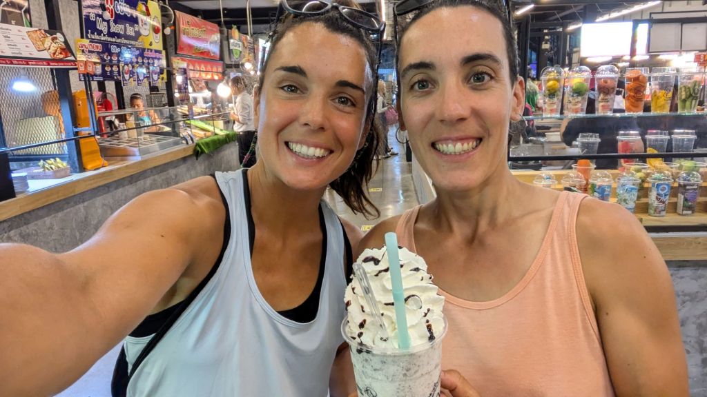 Compramos una sopa tipica «Tom Yum» con nuddels Pat Thai que llevaba huevo y diferentes bolas de carne o pescado. No nos ha flipado mucho. También hemos cogido unas bolas fritas de boniato muy ricas, un zumo natural de naranja y un batido de oreo.