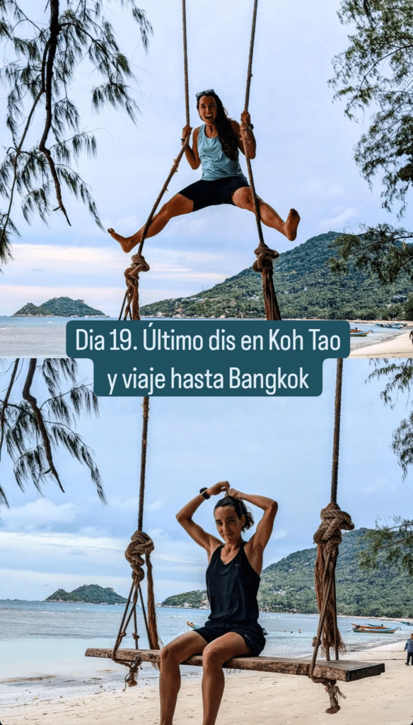 A las 7’25 salíamos de la habitación para devolver la moto y caminar hasta el puerto para desayunar. Nuevamente muesli con yogurt y fruta en el restaurante Zest (75 BTH cada una). Luego hemos callejeado por la avenida principal paralela a la playa y nos hemos hecho unas fotos en un columpio enorme.