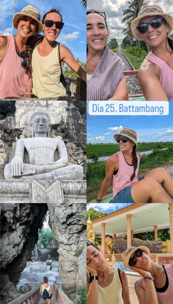 La ruta de la tarde ha sido más entretenida ya que hemos montado en un tren de bambú. Antiguamente se utilizaba para transportar los kilos de arroz de los arrozales y bananas, ya que las vias del tren que habian constuido los Kmher Rojos (los del genocidio en Camboya) estaban en deshuso y era una buena manera de reutilizar y ayudar en los desplazamientos de material. Ahora es puramente turistico y cobran 5 dólares por trayecto…
