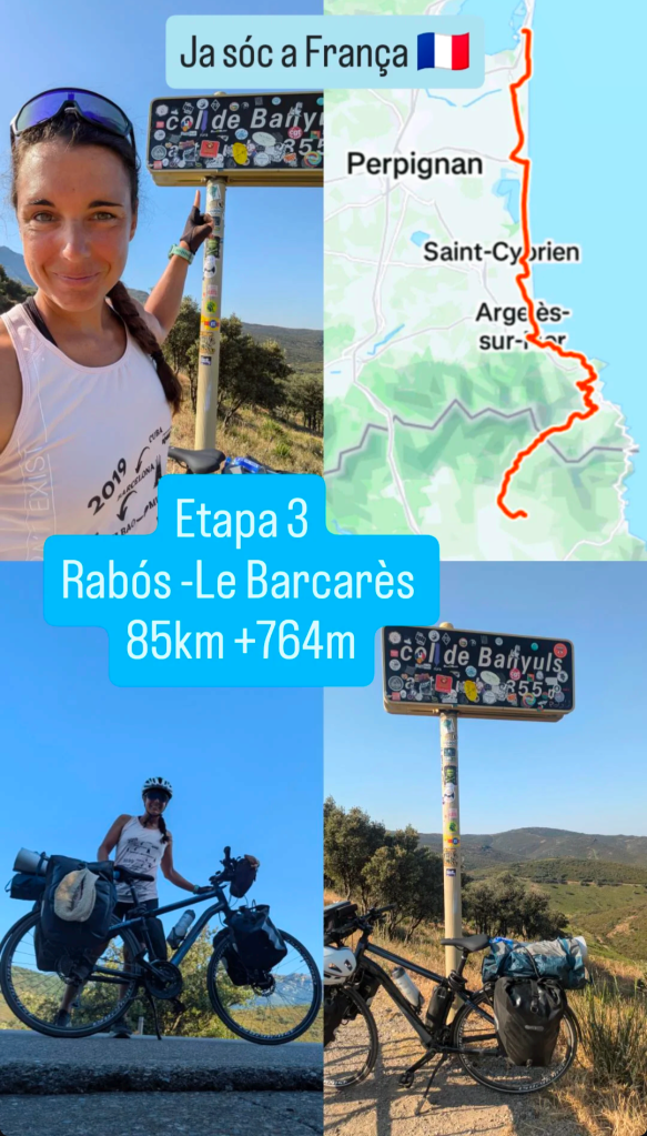 La bajada se hace bien, ésta parte es más empinada. Al llegar a Banyuls sur Mer, me toca nuevamente una subida por una vía ciclista «de la Cote Vermelle» . Se hace bien aunque hay un par de rampotes. Va pasando por viñedos y campos, sin ningún coche. El sol empieza a apretar y parece que hoy no tendré demasiada sombra así que toca ponerse crema.