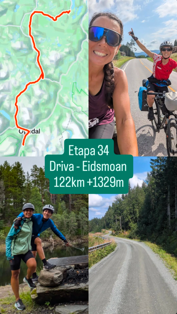 Hemos vuelto a hacer otra parada para coger fuerzas en una zona de picnic y refugio al lado de un lago y una tercera parada a escasos 40km del final donde nos hemos atiborrado a palitos con Nocilla. Creo que no lo contamos pero acabamos un pote de Nocilla en 3 días (probablemente yo comí el 60% y Aida el 40%…). No se si hacemos tanto deporte como para quemar todo ese azúcar, ahora bien, nos alegra más las etapas cuesta arriba, jejeje…