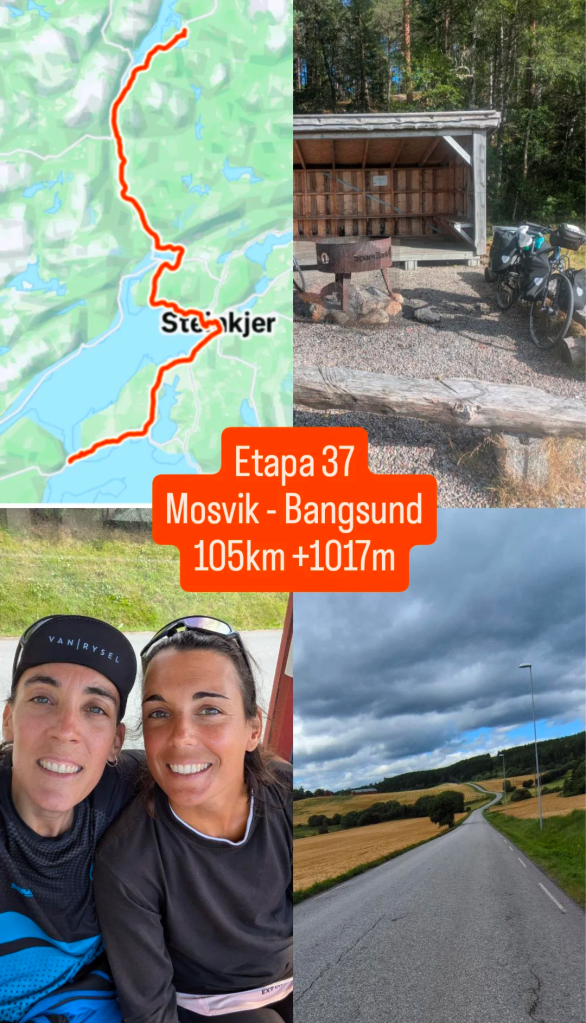 Pedaleamos 26km más, hasta Vellamelen, donde ahí nos paramos para comer plátano y cacahuetes. El camino hasta ahora es por carretera y algunos tramos de carril bici. La carretera no lleva casi coches aúnque no nos extraña. En todo Noruega (que es ENORME) solo está habitada por 5,5 millones de personas (Cataluña ronda casi los 8,5 millones) por lo tanto, es normal no encontrar tráfico… Mejor para nosotras.