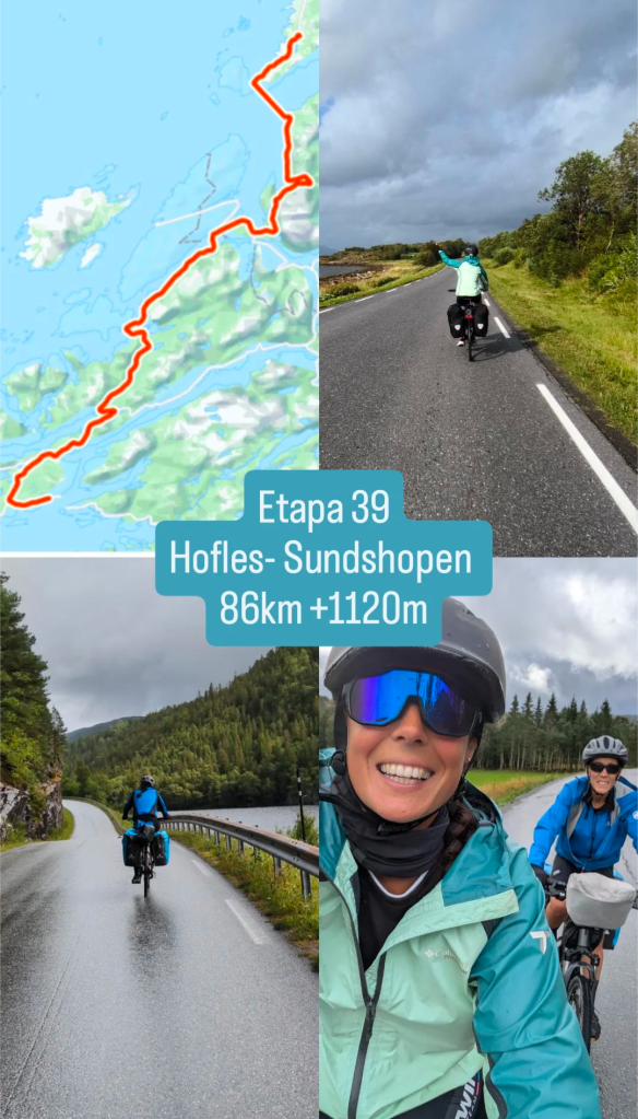 Salimos a las 7:30h y la primera parada es a escasos 12 km, en Kolvereid, donde paramos en el supermercado «Rema 1000» a por provisiones esenciales (Nocilla, galletas, queso, yogurt…). Al salir vemos que empieza a llover así que esperamos unos 40 min y, a la que para, seguimos avanzando.