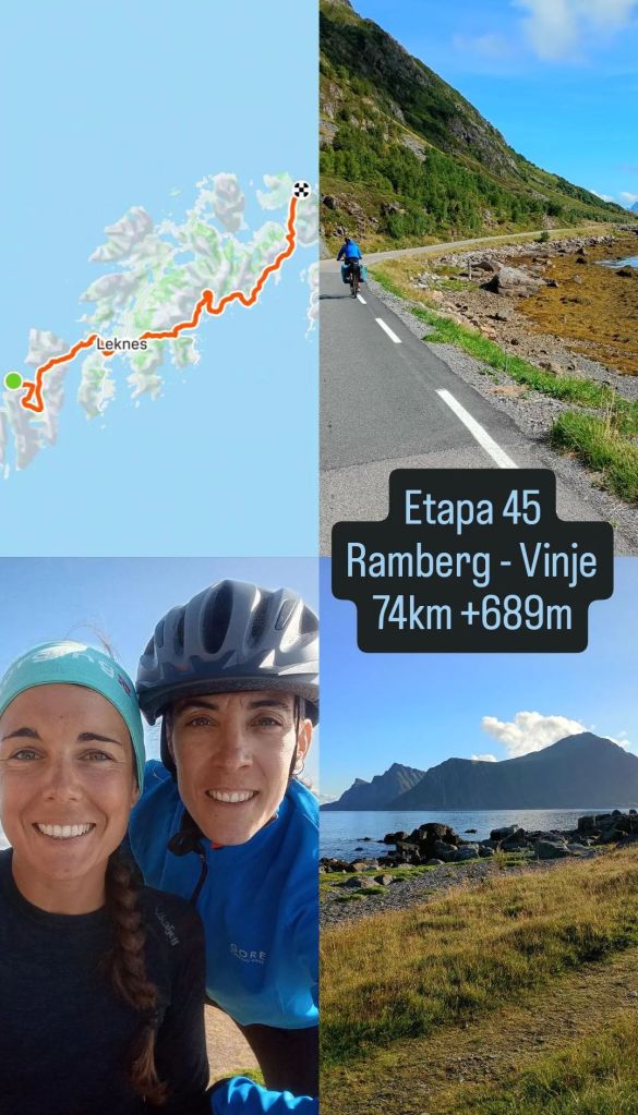 Al principio tenemos algo de viento en contra que se hace notar. Los primeros 30 km avanzamos lento, quizá por el viento, quizá por el desnivel (aunque no ha sido una etapa de mucho pendiente…). Pero después de Leknes la cosa mejora y pedaleamos por una carretera secundaria preciosa.