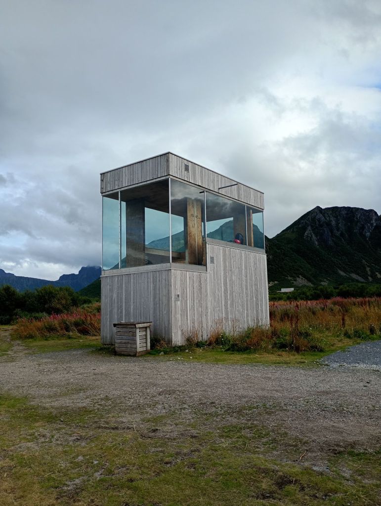 Otros 10 km con viento en contra y luego la cosa mejora porque el viento lo tenemos de lado. Durante 15 km hacemos sube- baja constantes hasta que llegamos a la entrada de Svolvær. Aquí paramos en el super a por plátanos, manzanas y yogurt. Comemos algo en las mesas de fuera y seguimos pedaleando otros 17 km hasta un mirador. Alguna foto de rigor y giramos a la izquierda por una carretera secundaria sin casi nada de trafico donde, en ocasiones, tenemos el viento un poco de lado y a favor. Maravilloso.