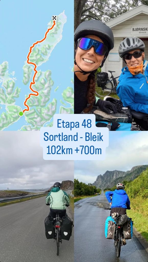 Los primeros 15km han sido por carril bici, con casetas de bus donde resguardarnos de la lluvia. Luego ya ha dejado de llover pero en 50km no hemos encontrado nada. Tras cruzar un puente, llegamos a una pequeña población, Risoyhamn. Ahí nos volvemos a juntar con los suizos. Es la parada para descansar y comer algo (pan, embutido, plátano, chocolate y cacahuetes). Enseguida volvemos a subirnos a la bici para afrontar los últimos 50km.