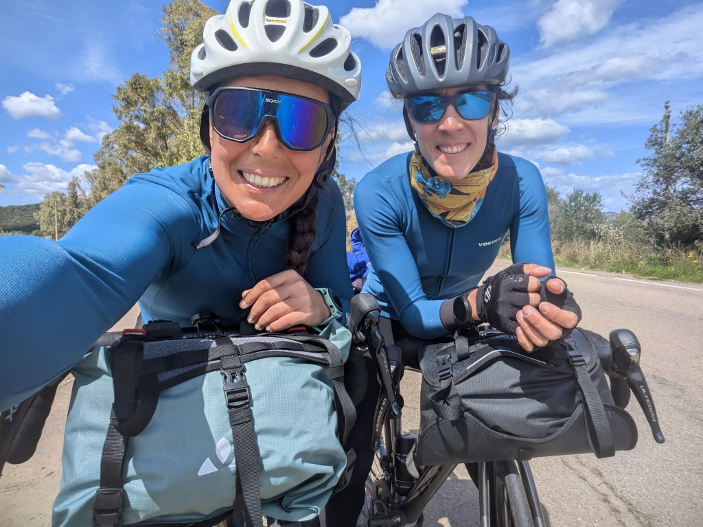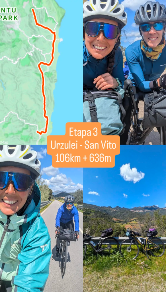 Recogemos las cosas y hoy decidimos vestirnos de largo: culote largo y maillot de manga larga. Tenemos 30 km de bajada hasta Tortolì, así que añadimos chaqueta y guantes de invierno. Estamos listas para el descenso, con ese punto de emoción de quien sabe que hoy toca “dejarse caer”… o eso creemos.